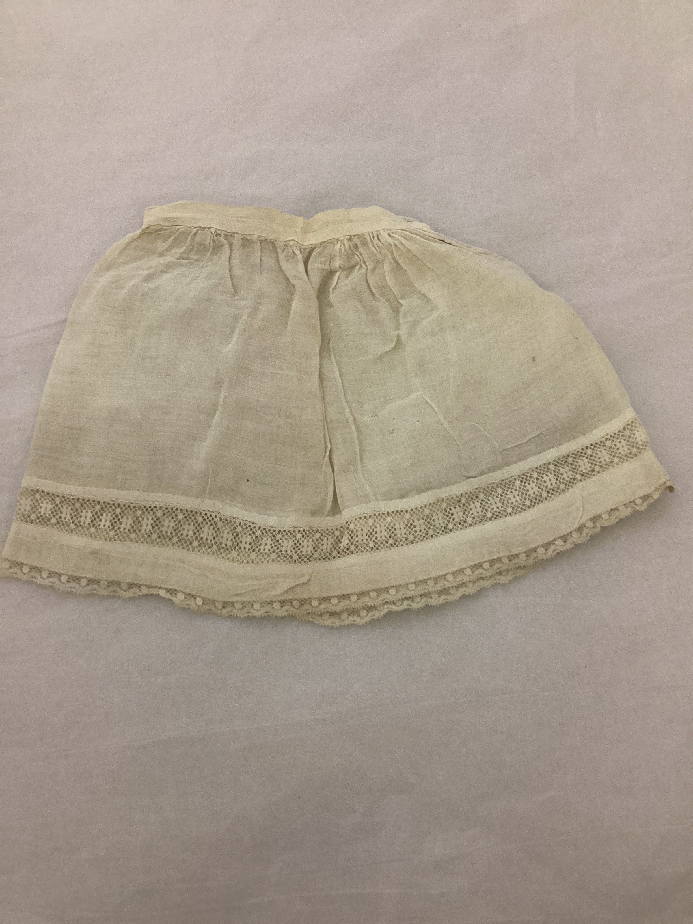 White cotton doll petticoat with lace insertion and lace on bottom edge; gathered into 3/8" waistband; small white button.Collection