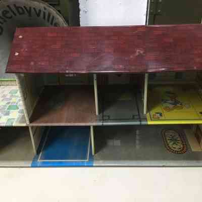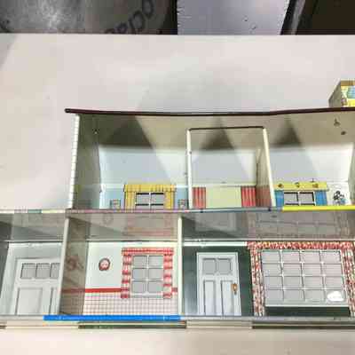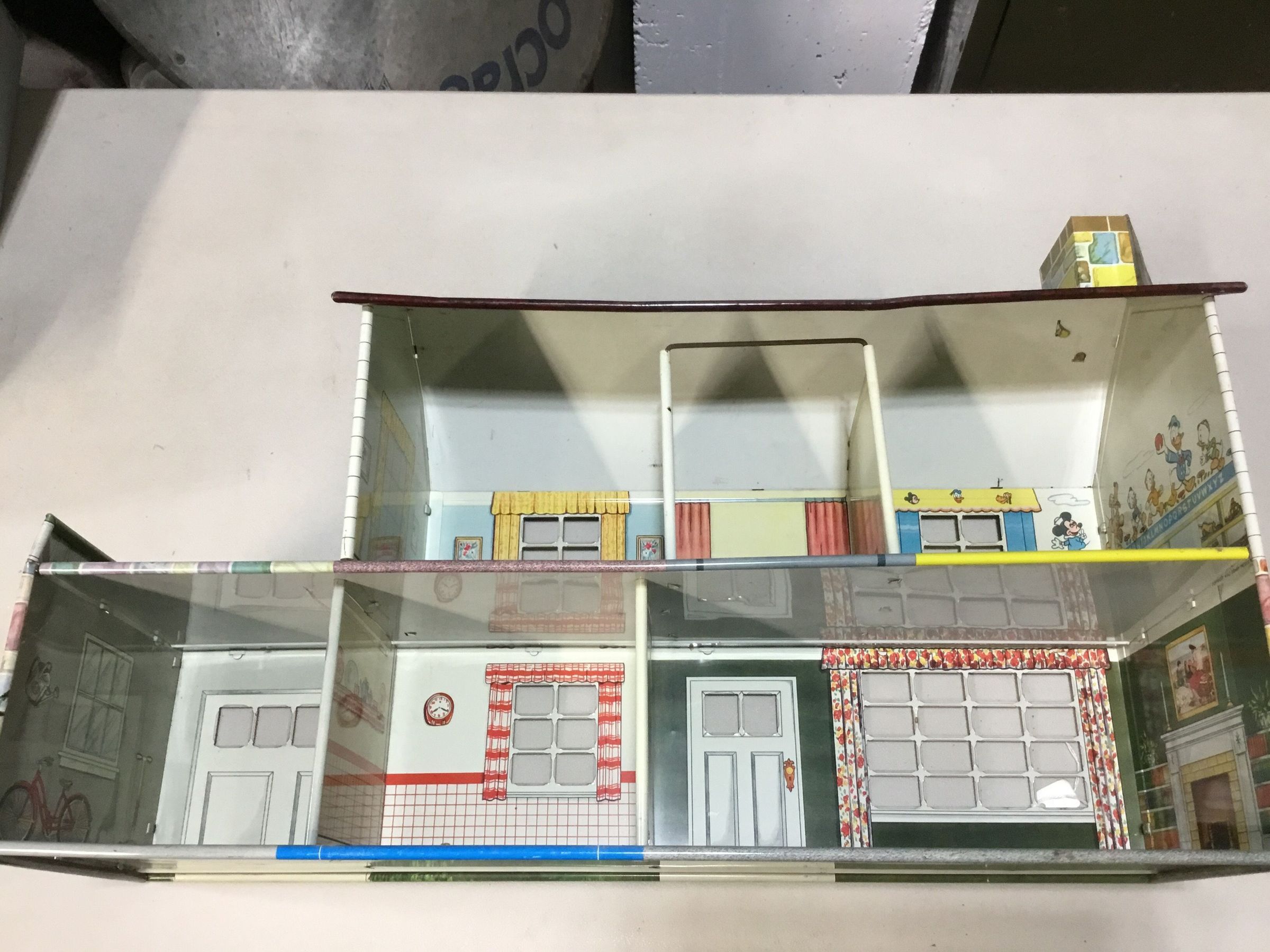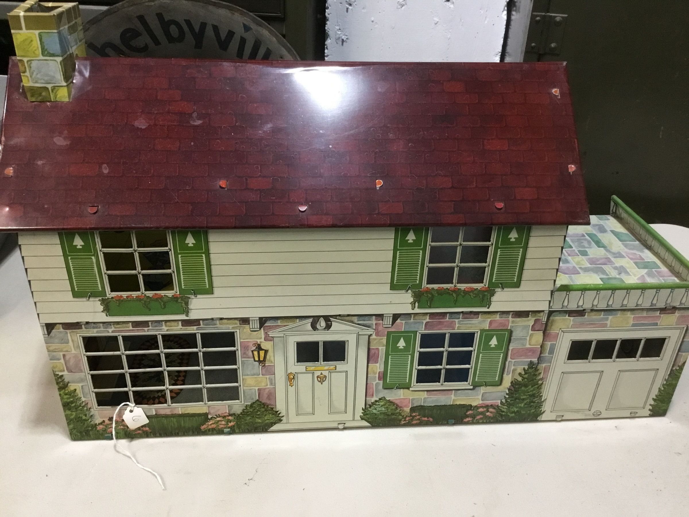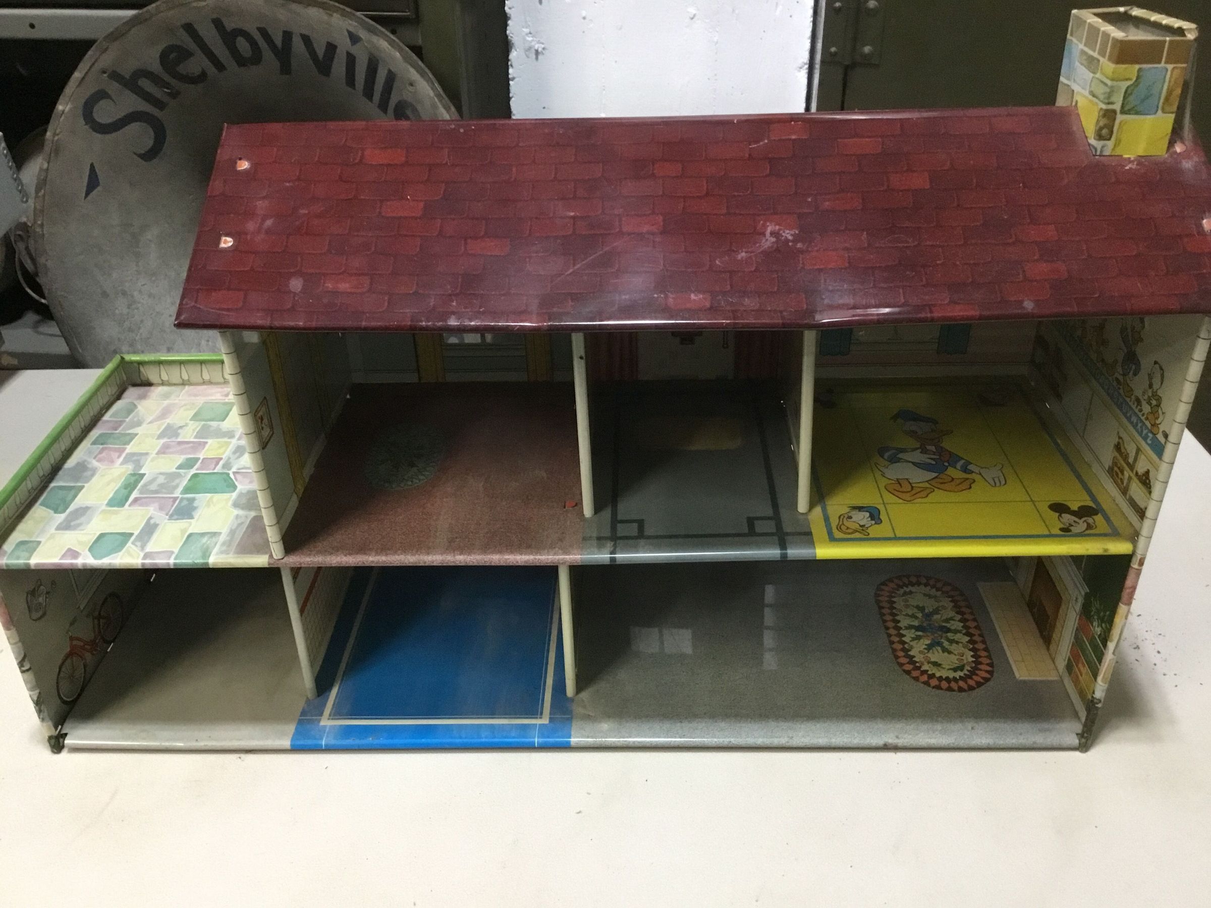 Metal dollhouse with Disney theme. Five rooms with attached garage with rooftop patio. Roof has chimney. Outside is stone on bottom, white aluminum siding on top; windows have green shudders. Interior rooms are preprinted with designs and Disney themed.Collection