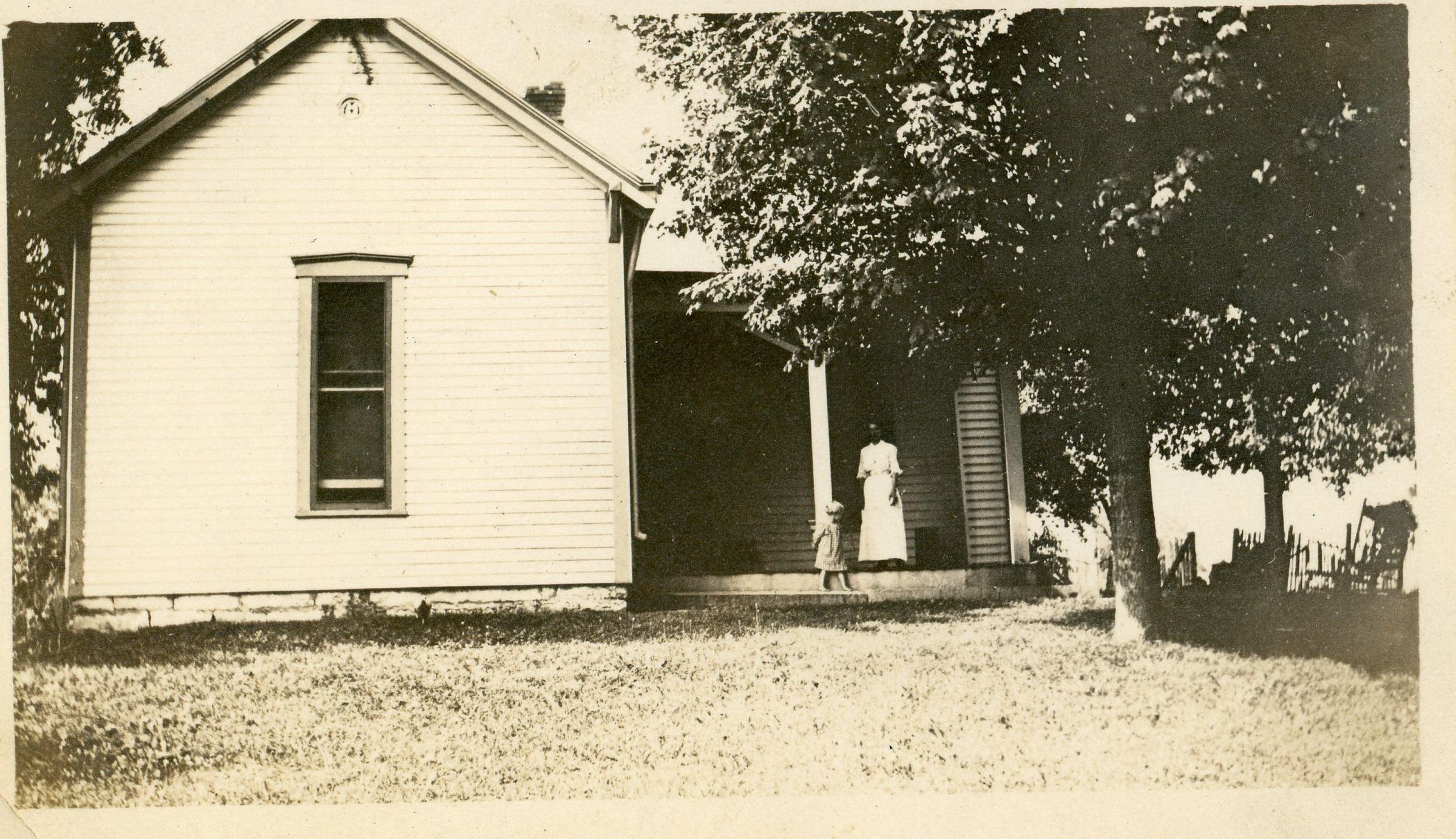 A black and white snapshot of a woman and small child, standing in the background on the front porch of a house. The woman wears a white dress. The foreground of the photograph is made up of a grassy lawn, with a lone tree standing in the middle ground.Photograph Details