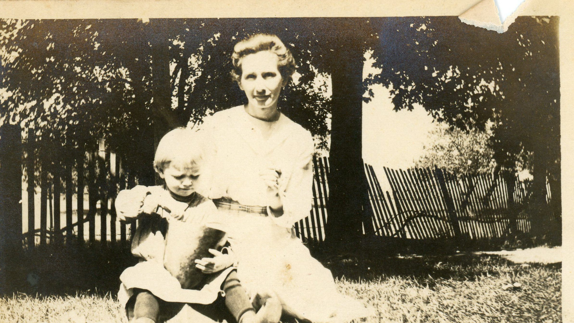 A sepia-toned snapshot of a woman and young child sitting on a grass lawn in front of a wooden fence lined with trees. The woman has light hair pulled away from her face in a small pompadour. She wears a white dress and looks directly at the camera. The child has light hair and is looking down at a some sort of container held in her lap.Photograph Details