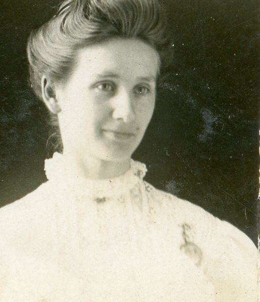 A sepia-toned headshot of a woman with light hair pulled away from her face in a pompadour. She wears a white lawn dress with a high, ruffled collar.Photograph Details