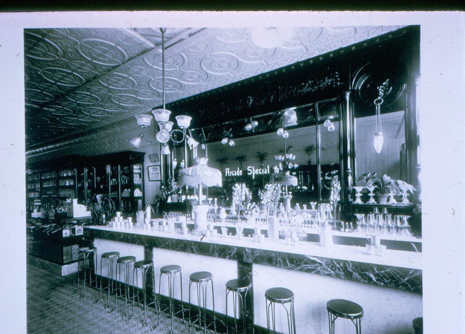 Donation, 07/26/2005. Black and white photographic slide in landscape format. Frame is marked: "Soda Fountain/Doran & Means S.W. P. Sq."Collection