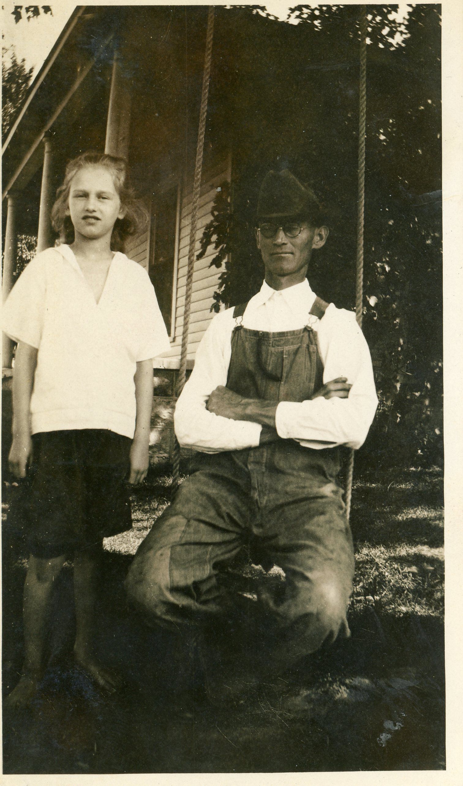 A sepia-toned snapshot of a young girl and a man. The girl is standing and has short light hair pulled away from her face. She wears a white sailor shirt and a dark skirt. She is barefoot. The man sits on a swing hanging via two braided ropes. He wears a dark hat, glasses, a white collared shirt, and overalls. His arms are crossed over his chest.Photograph Details