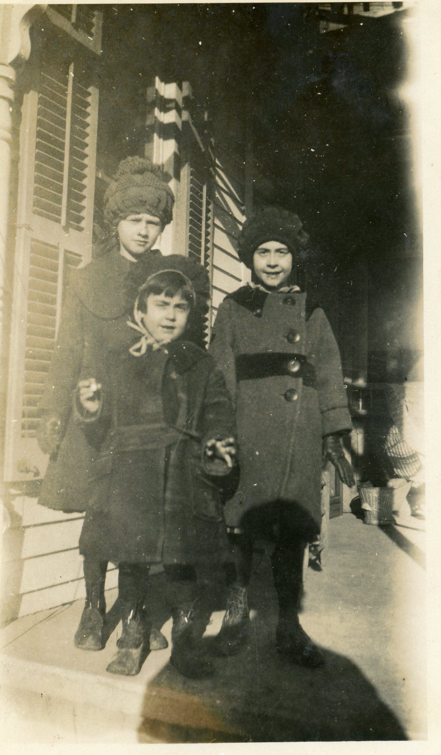 A sepia-toned snapshot of three young girls in winter hats and coats. They standing beneath a covered porch, in front of the exterior facade of house.Photograph Details
