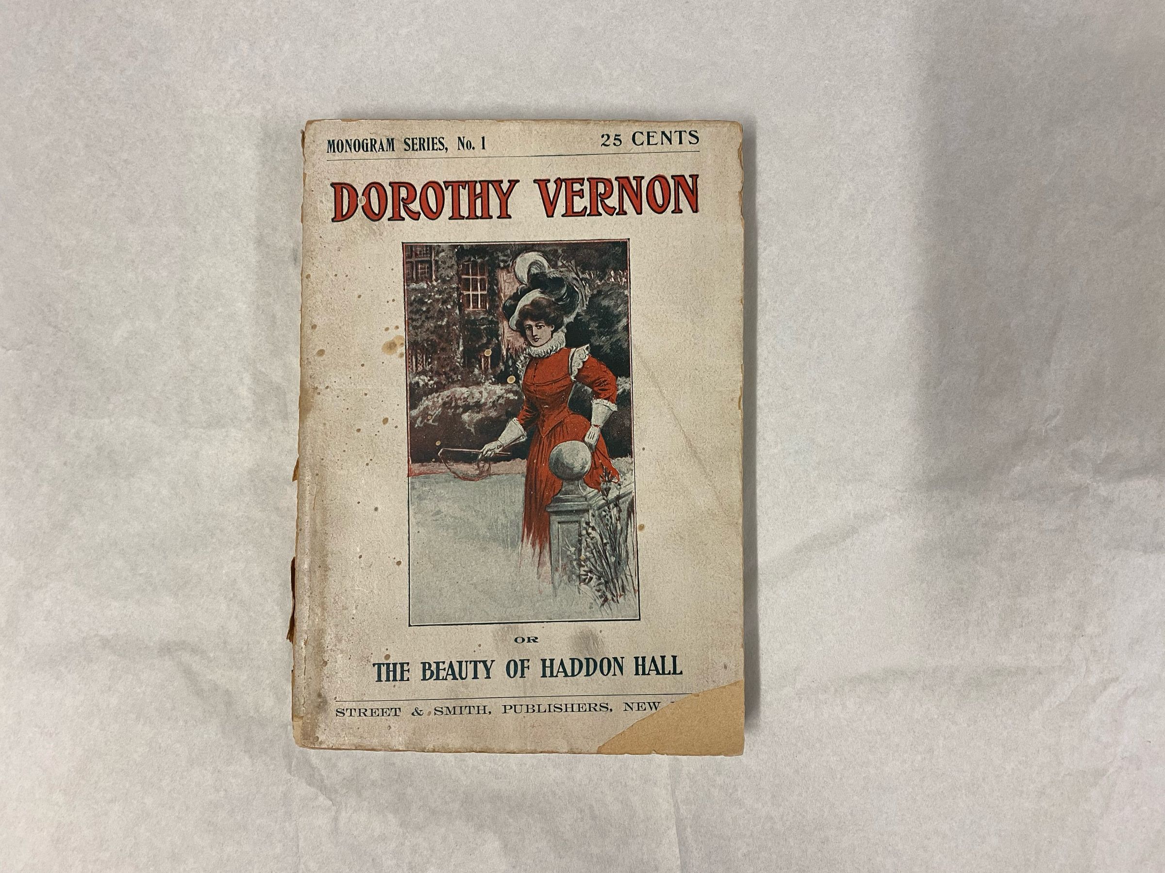 A paperback book, titled "Dorothy Vernon" in large red letters outlined in black. Above the book's title reads, "Monogram Series, No. " and "25 Cents." Beneath the title is an illustration of a woman with brown hair, standing before an ivy-covered stone house. She dons Edwardian garb, including a vibrant red corset with white ruffled sleeve caps and matching skirt, long white gloves, a white ruff collar, and a white feather hat. In her right hand, she carries an unknown object. Beneath the illustration reads the secondary title, "or, the Beauty of Haddon Hall," in green lettering. The publishing company also appears at the bottom of the front cover in green lettering, "Street & Smith, Publishers, New-." Due to a rip at the bottom of the front cover, the last word, presumably "York," cannot be read.Context