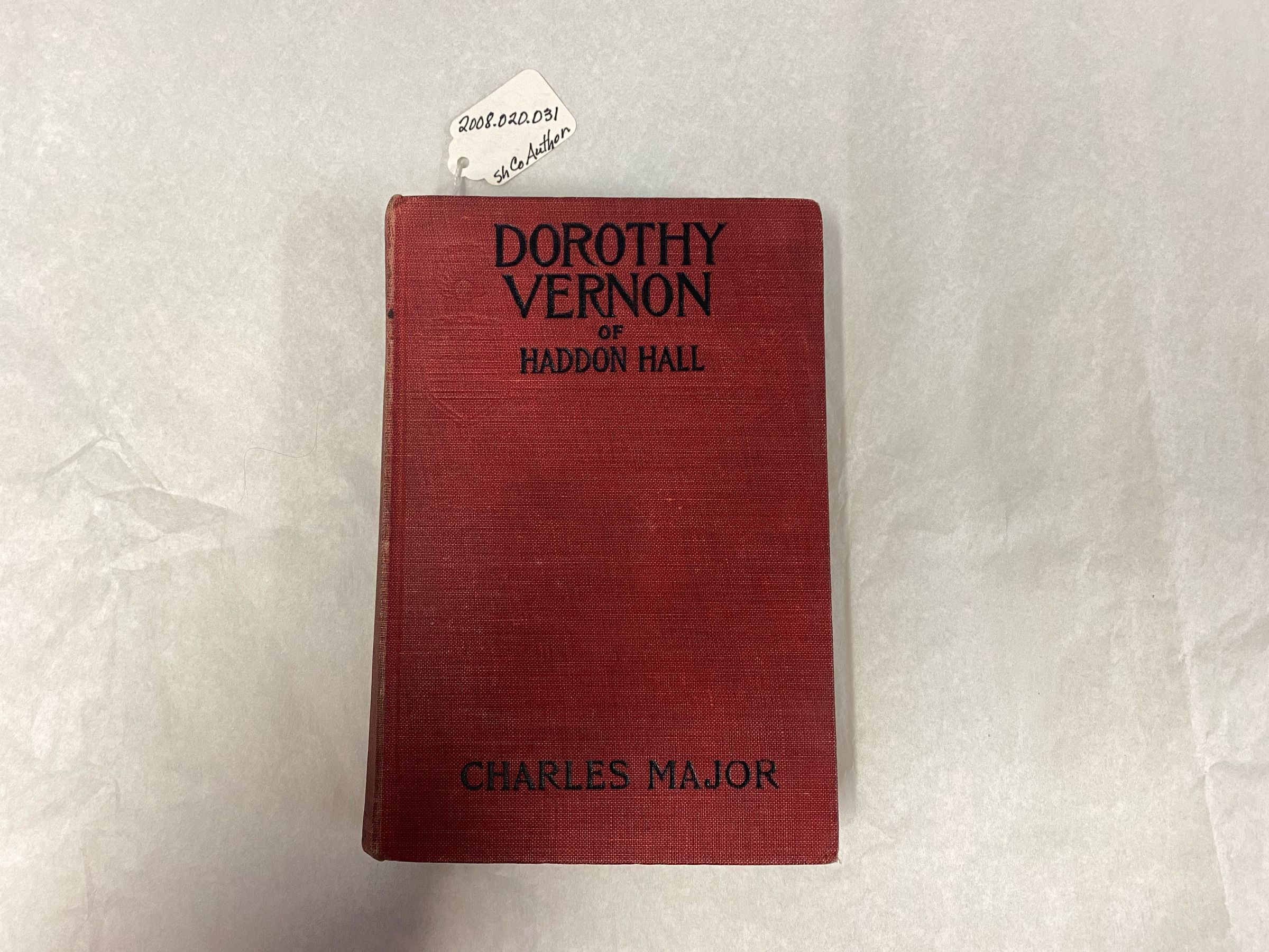 A copy of "Dorothy Vernon of Haddon Hall" by Charles Major, with black-stamped title centered between two blind-stamped decorations on red buckram. Though not easily seen, the blind-stamped decorations depict two emblems / crests. On the left-hand side, a peacock stands perched above a crest. On the right-hand side, a boar's head sits above a crest containing an X that crosses through a diamond shape at the center. The author's name is also black-stamped at the bottom of the front cover. This photoplay edition, the Mary Pickford Edition, includes photographs of Canadian actress Mary Pickford as she appeared in the novel's 1924 film adaptation.Category