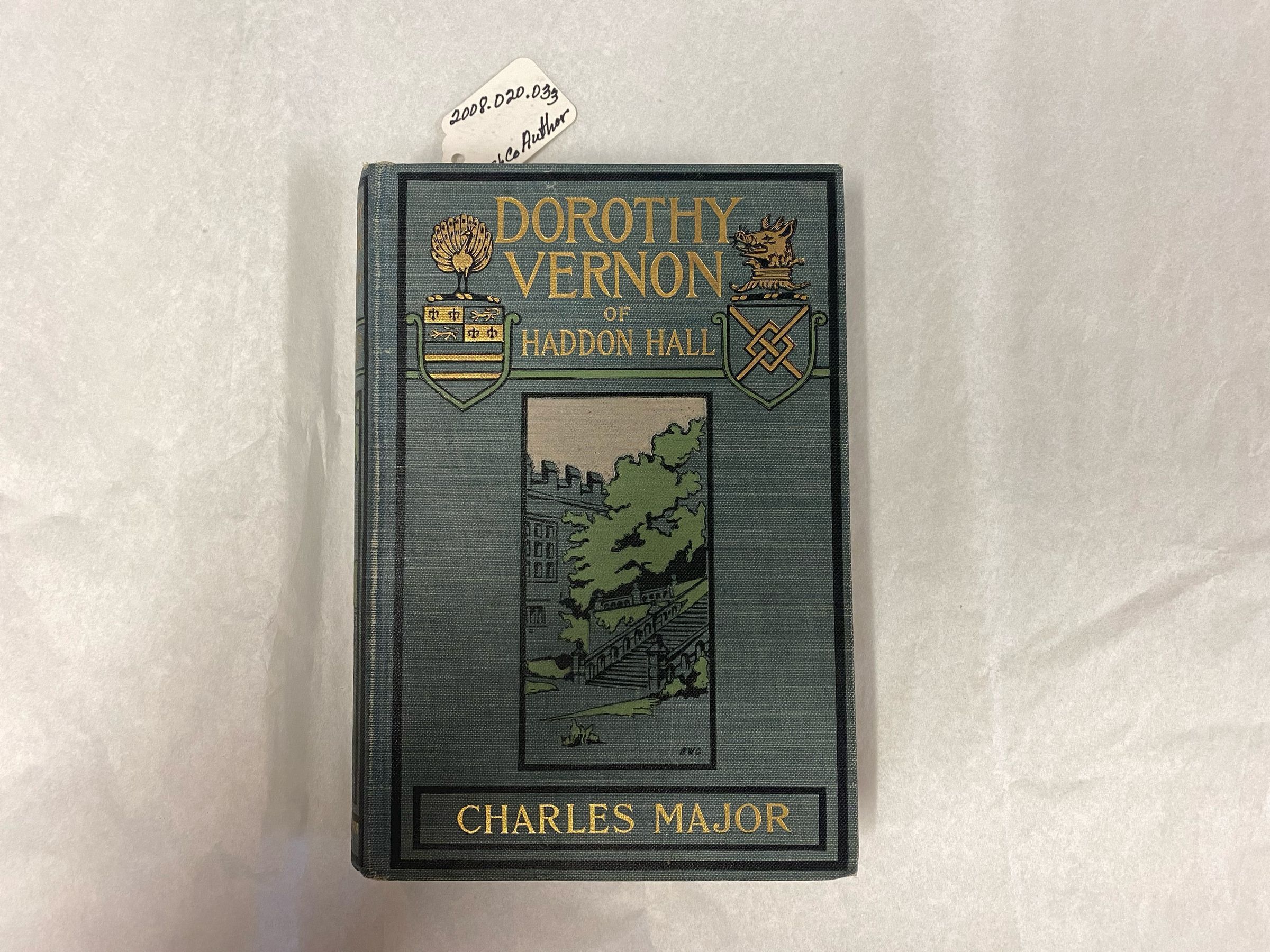 A blue / gray hardcover copy of "Dorothy Vernon of Haddon Hall" by Charles Major. The book's title and the author's name appear in gold lettering on the front cover, as do two emblems / crests outlined in green. On the left-hand side, a golden peacock stands perched above a crest with several small symbols, including two animals (possibly feline). On the right-hand side, a boar's head sits above a crest containing an X that crosses through a diamond shape at the center. Beneath a green line under the book's title, an illustration of an outdoors staircase leading to a stone building, surrounded by greenery, is outlined by a black border. The author's name is also outlined with a black border at the bottom of the front cover.Category