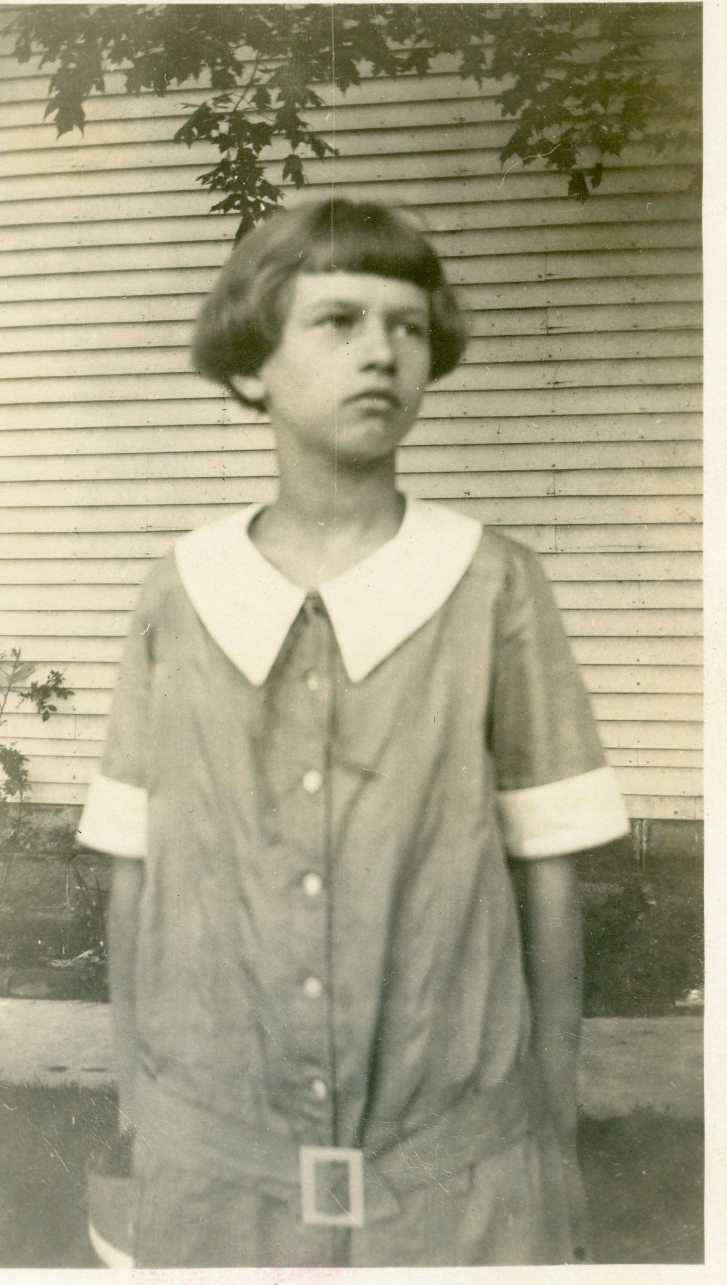 A sepia-toned snapshot of a young girl with short light hair and blunt bangs.Photograph Details
