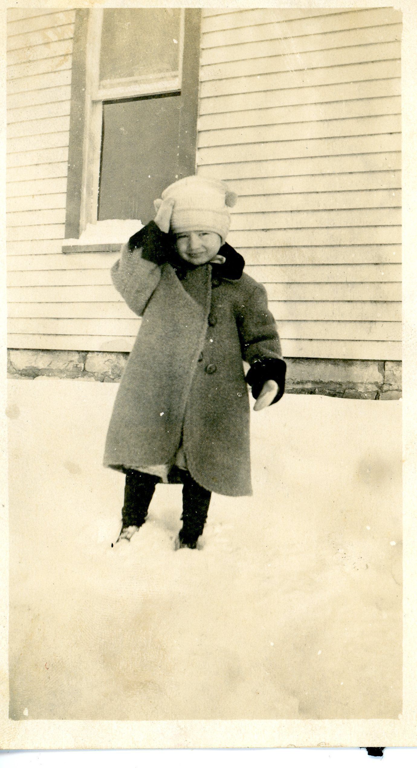 A sepia-toned snapshot of a young child wearing a winter hat, coat, gloves, and boots standing in the snow in front of a house.Photograph Details