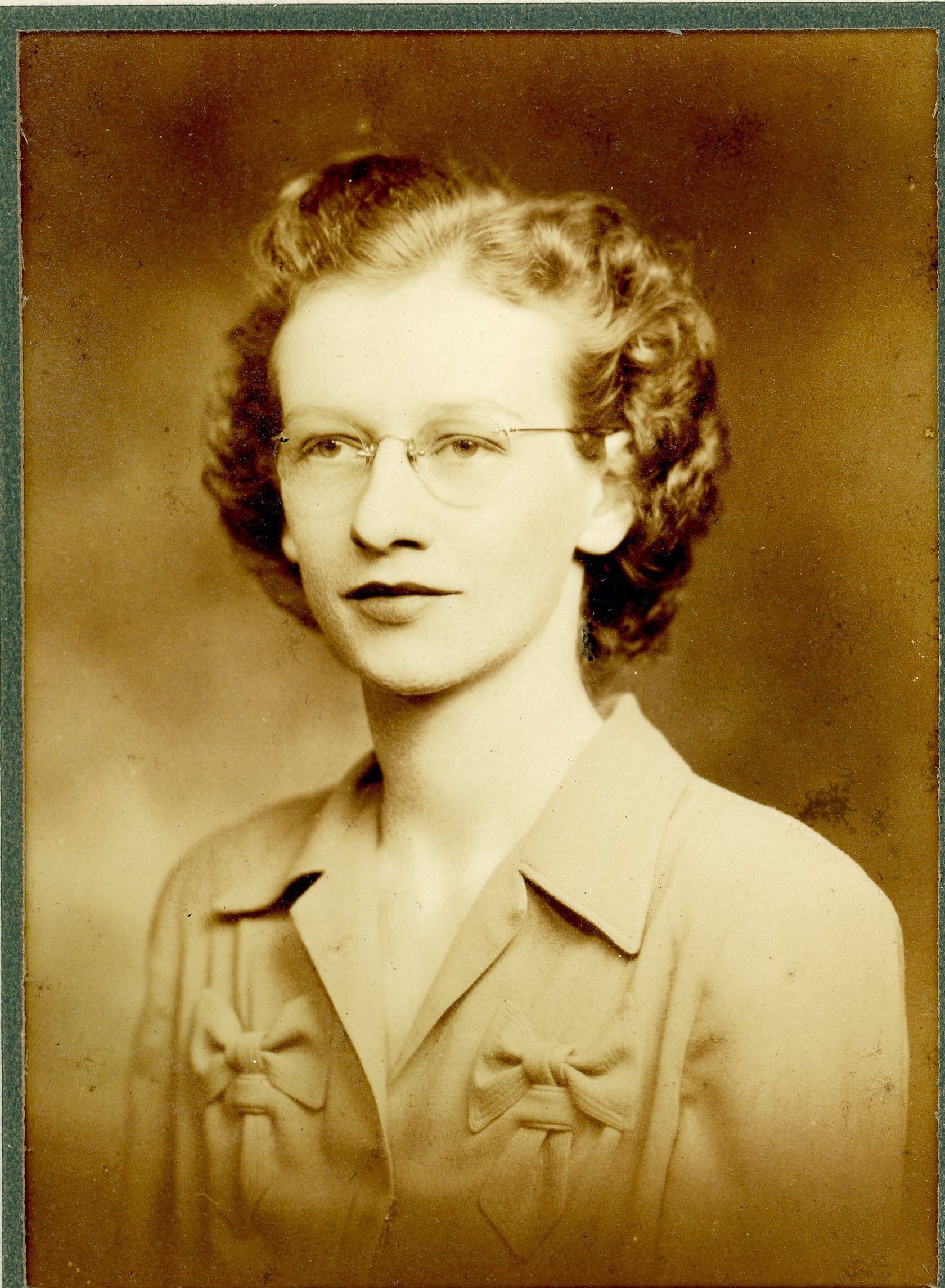 A sepia-toned portrait photograph of a woman with short, light curly hair and light eyes. She wears frameless wire circle glasses, lipstick, and a collared, button-down blouse or dress adorned with bows at each breast.Photograph Details