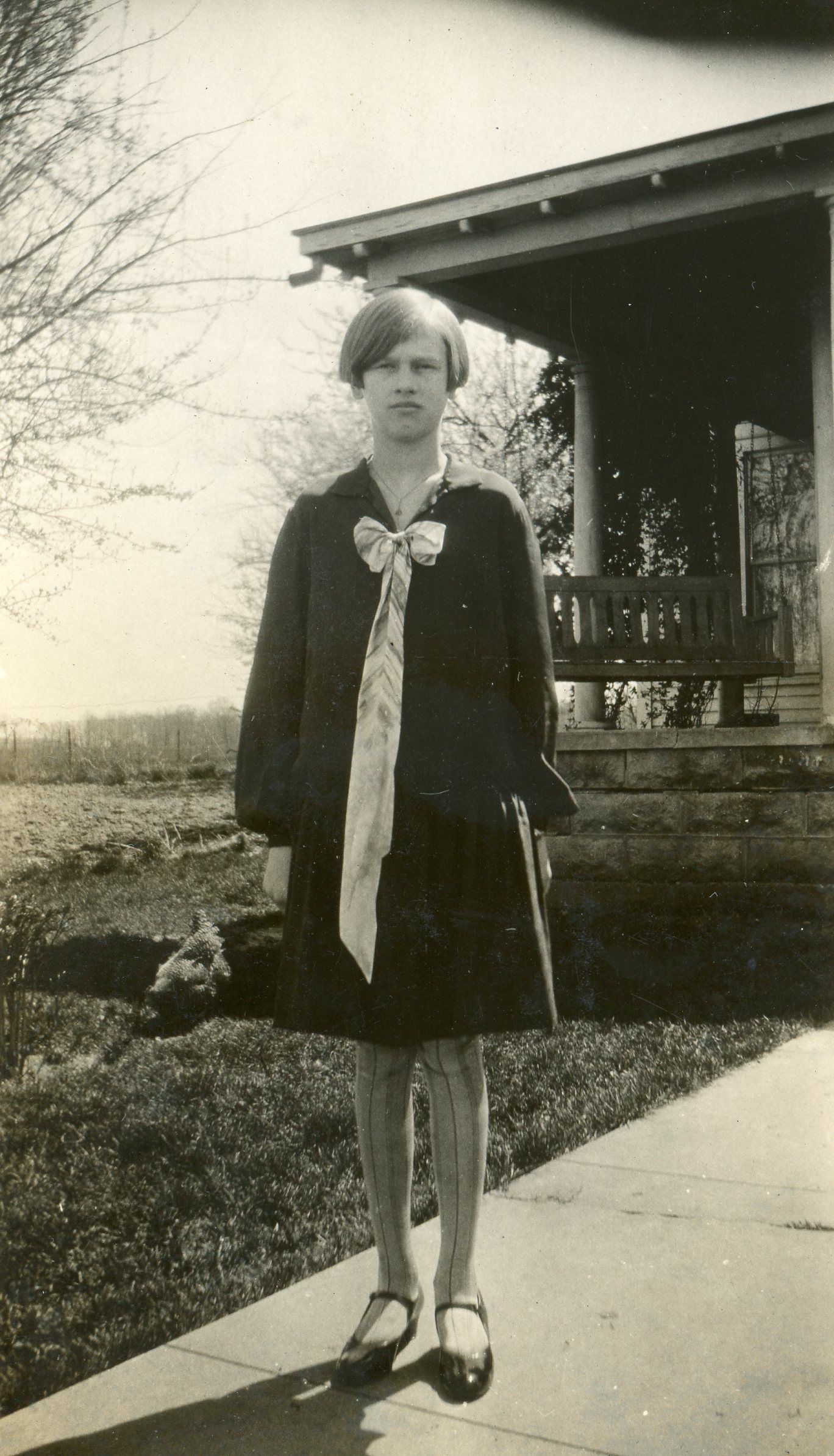 A black-and-white snapshot of a short-haired girl standing in front of the exterior of a house. She wears a long-sleeved black dress with a bow at the yoke, striped tights, and black patent Mary Jane shoes.Photograph Details