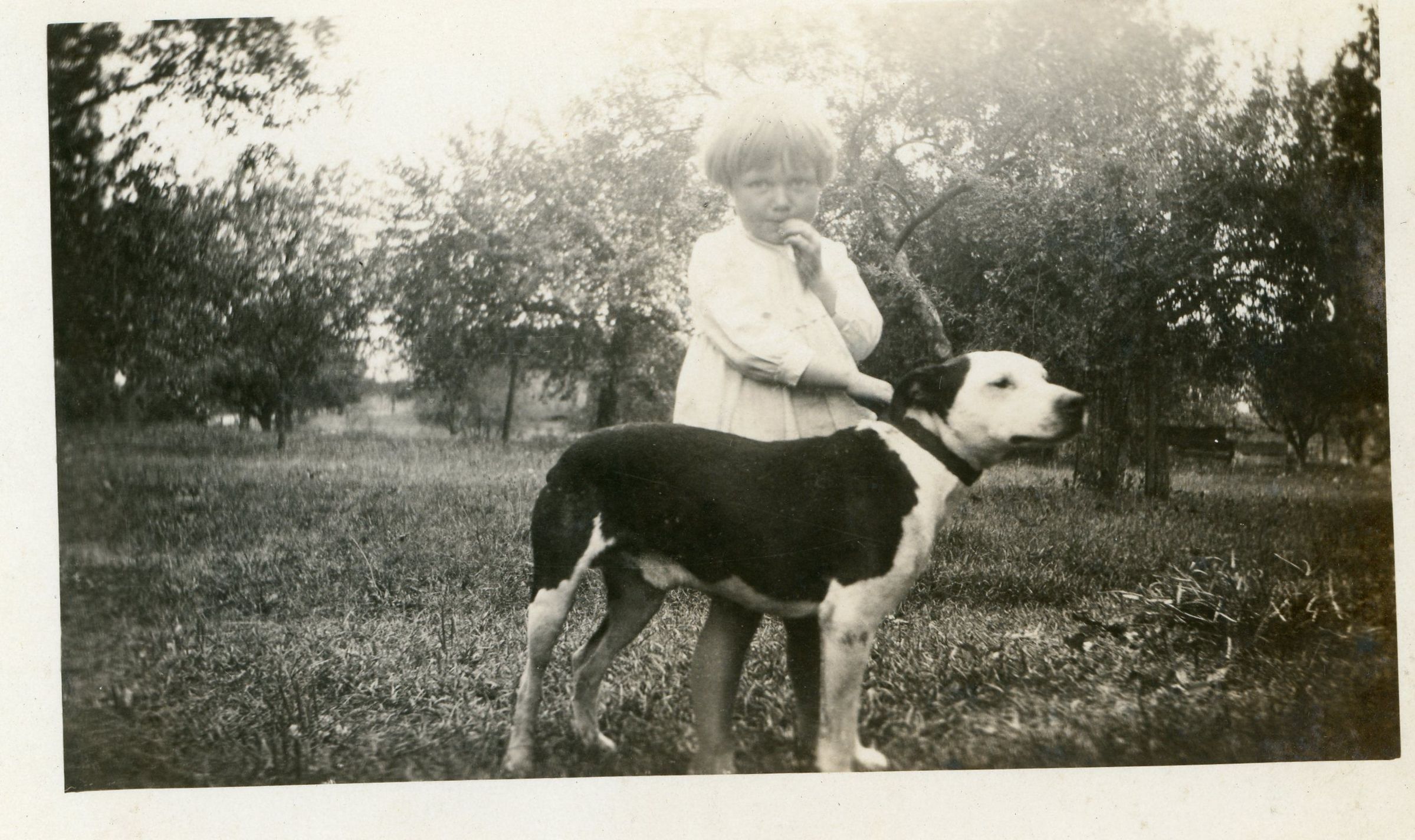 A sepia-toned snapshot of a young girl in a white dress and bare feet standing behind a two-toned dog on a grass lawn. The girl is holding onto the dog's collar.Photograph Details