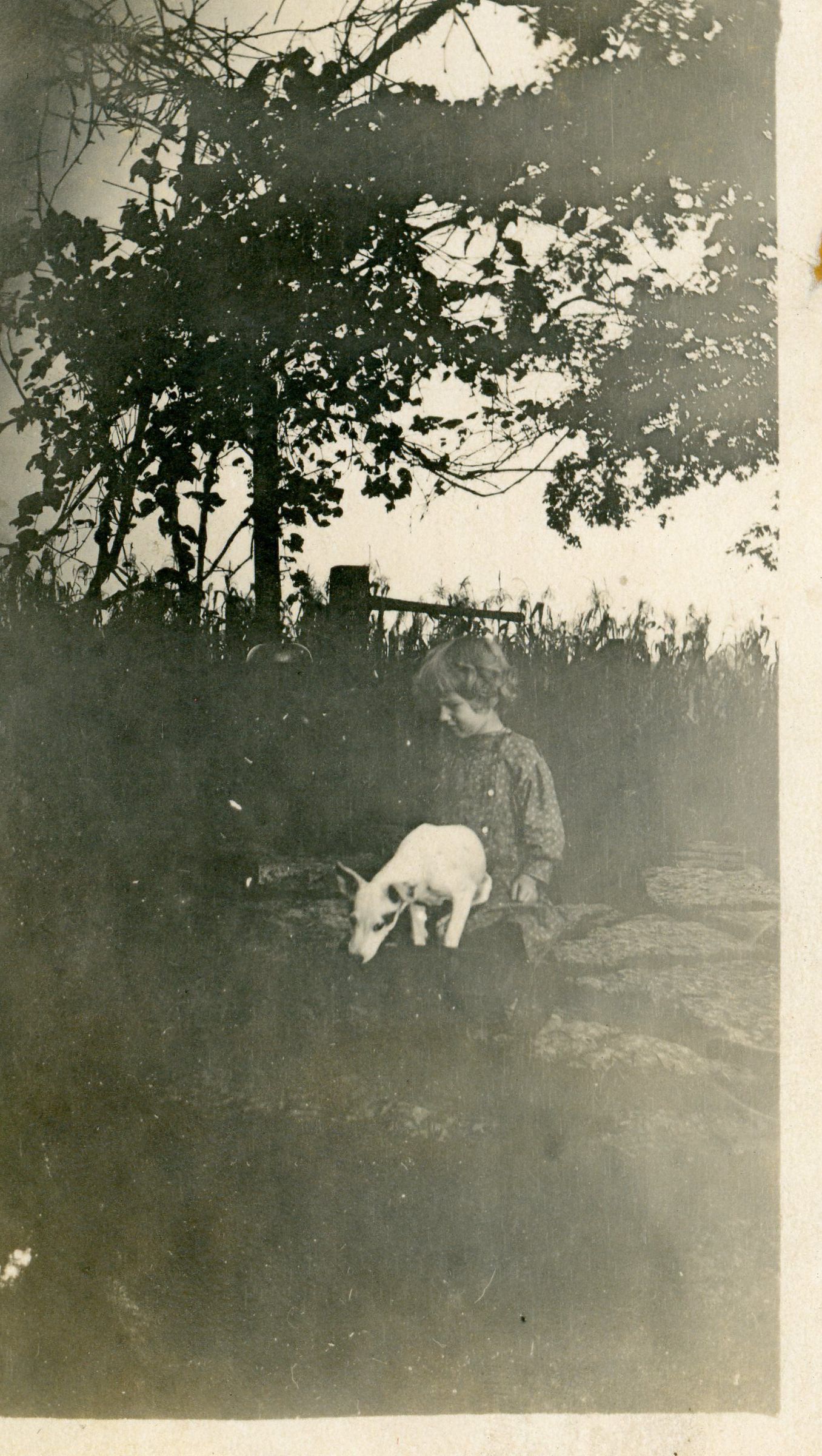 A sepia-toned snapshot of a young girl with a small white dog. The girl has light short hair with blunt bangs and wears a patterned long-sleeved dress with buttons down one side. The background is lined with trees, a tall wooden fence, and a crop field.Photograph Details