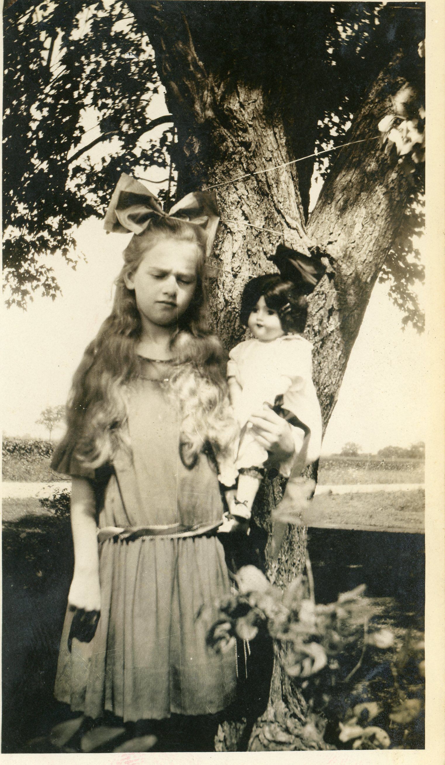 A sepia-toned snapshot of a young girl with long light hair pulled away from her face with a large bow. She wears a dress with a braided belt. She stands in front of a tree holding a brunette doll in a white dress.Photograph Details