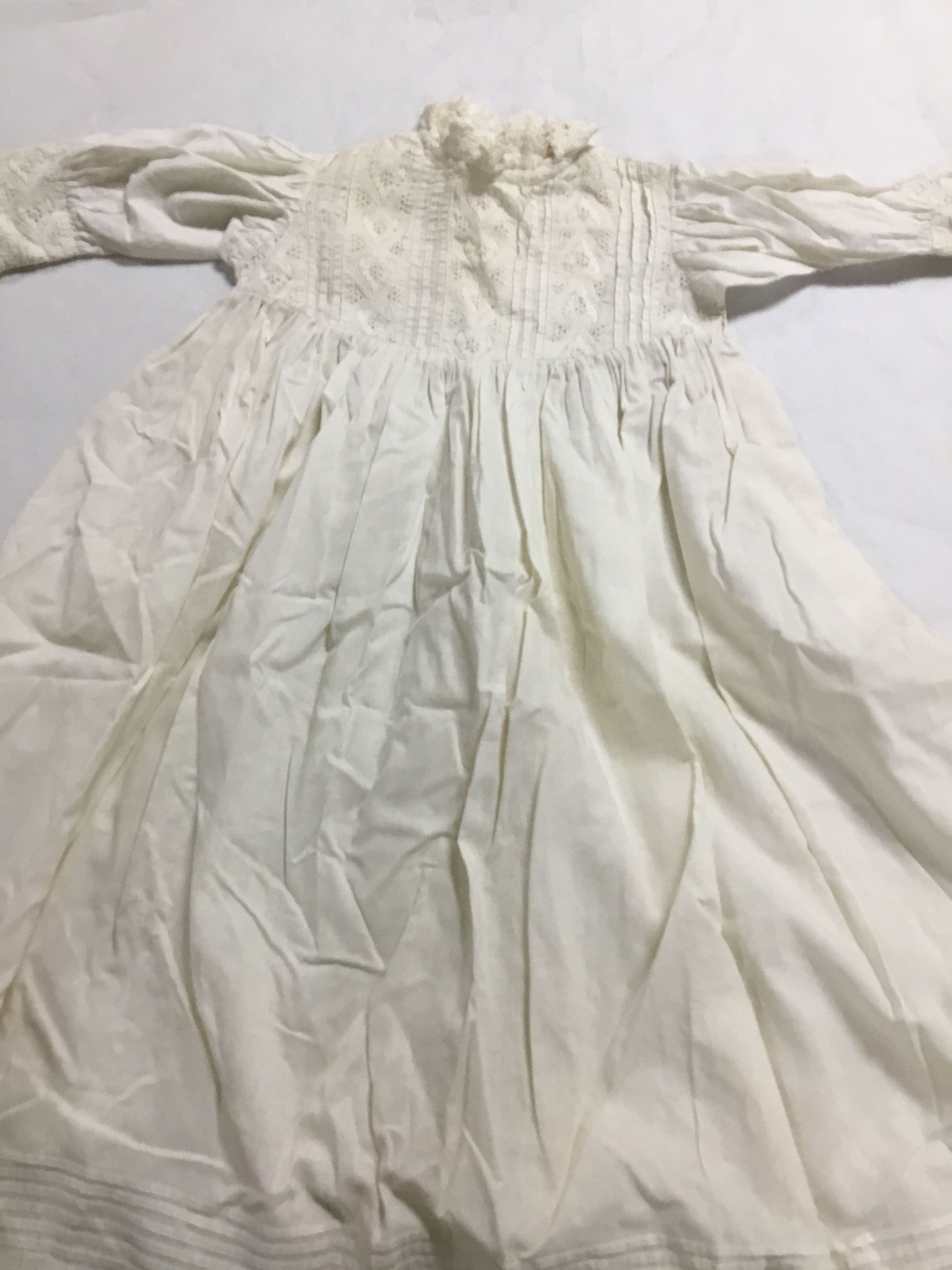 Long baby dress; short bodice of eyelet and tucks; neck edged with eyelet ruffle; cuffs of eyelet; hem of skirt trimmed with tucks and eyelet.