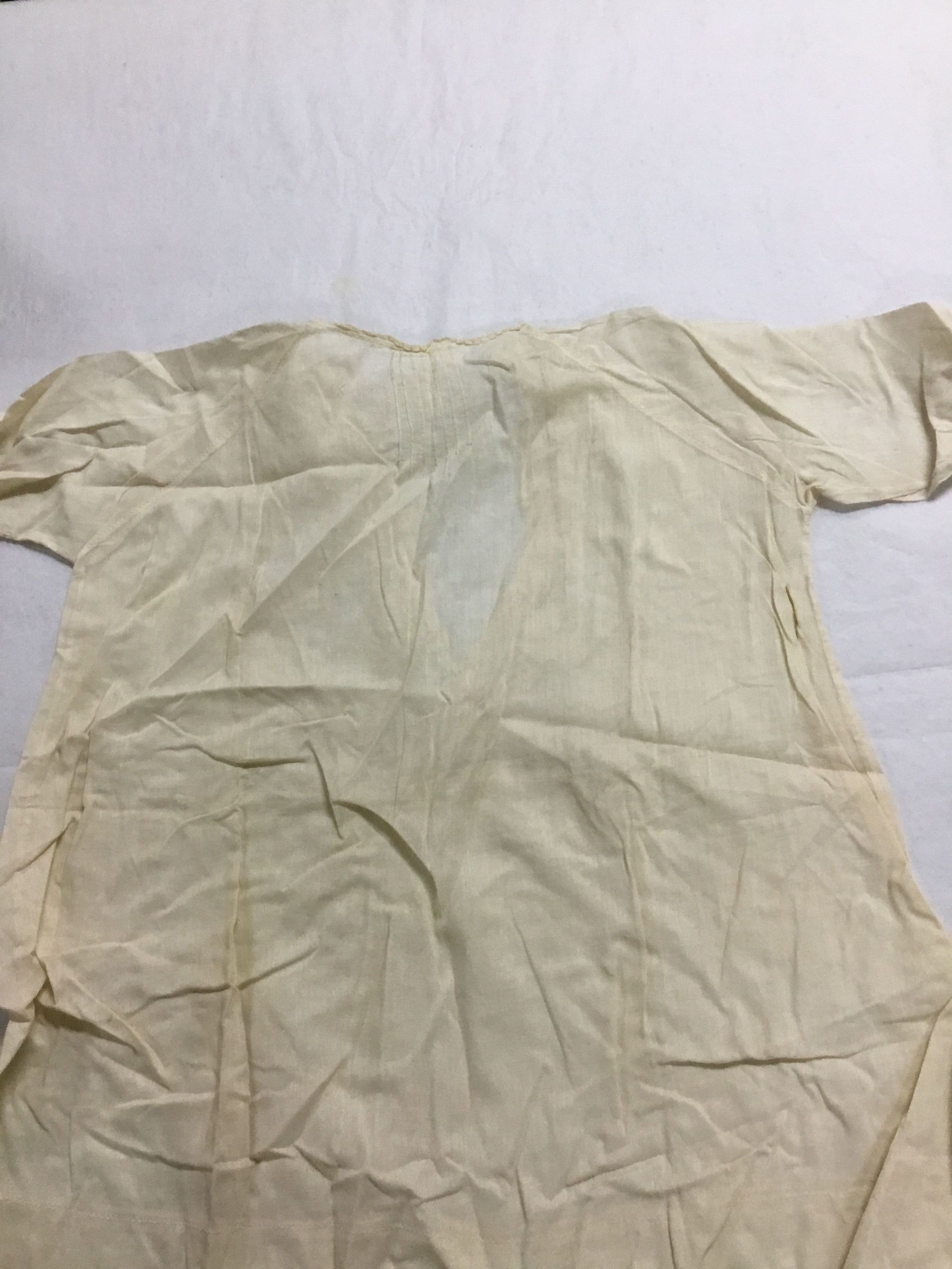 White cotton dress with ragland 3/4 length sleeves that are gathered at the end; 1/8" lace is at the edge of length, sleeves and neck line; jewel neck line has 7 tiny tucks at the center front 2" long; ragland seam and hem line are top feather stitched; 7" opening is at the back center; closures are 3 tiny buttons; there are two 2" tucks on each side of the opening..Collection
