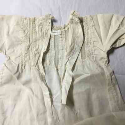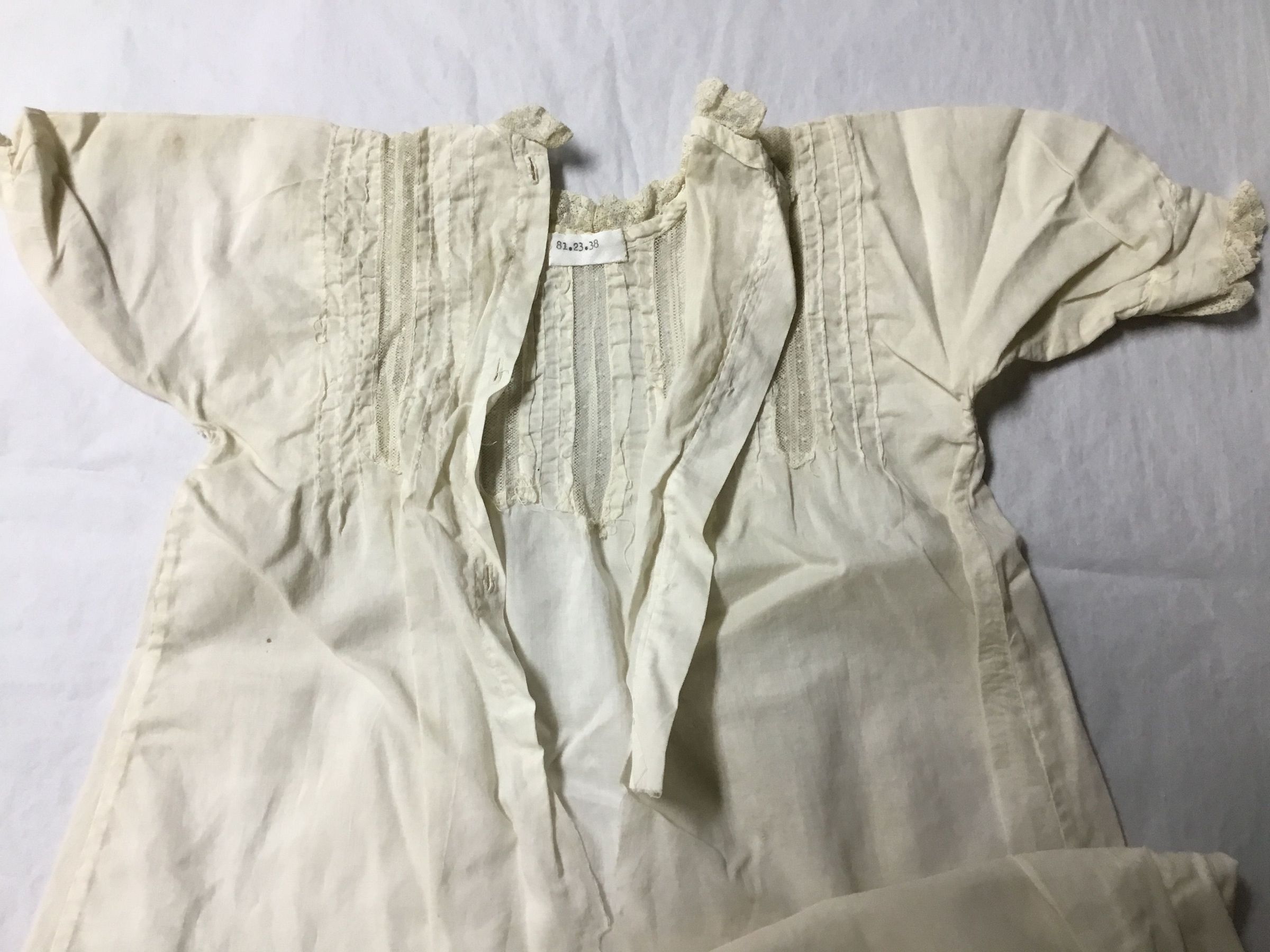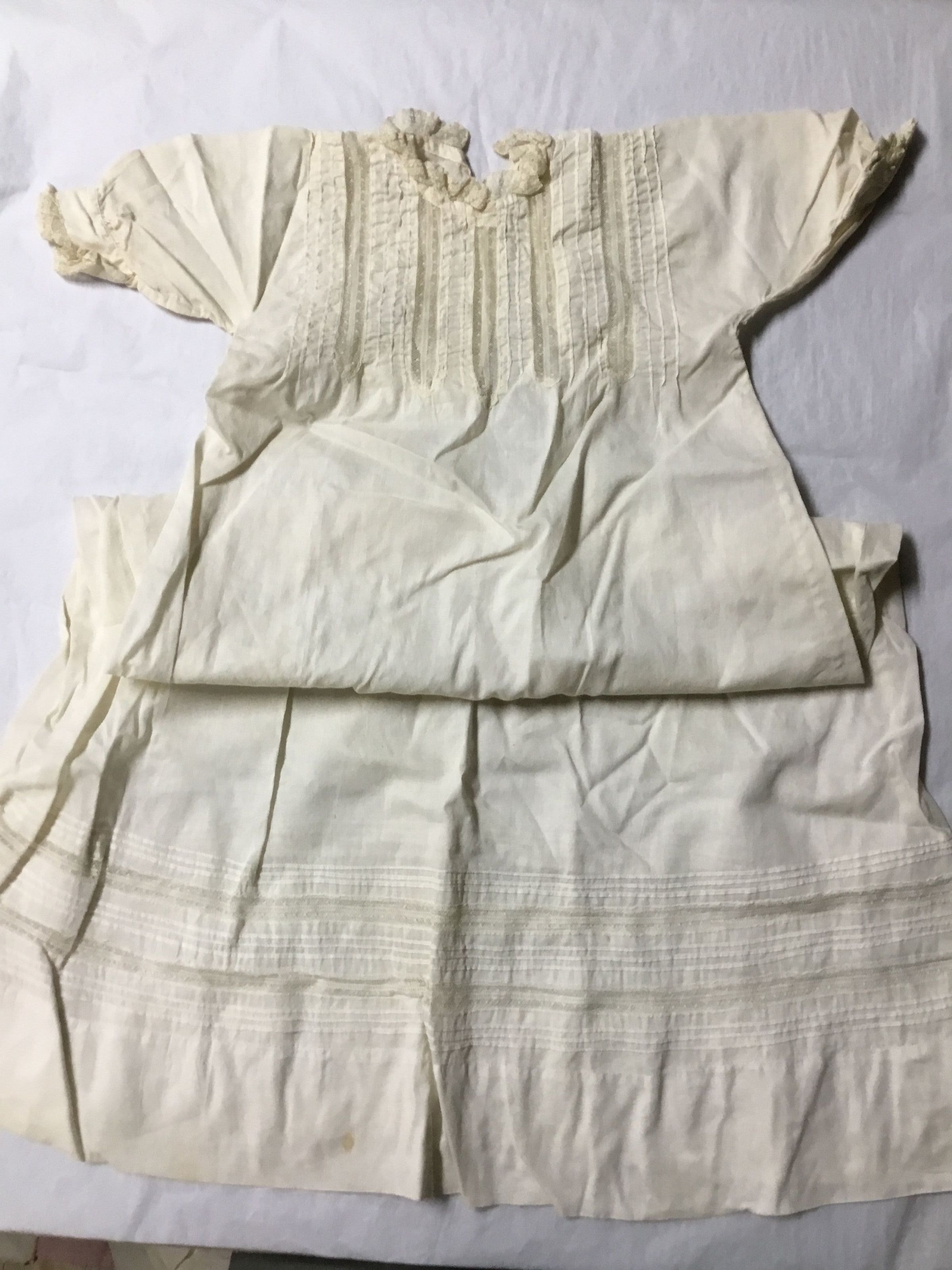 Long baby dress; lace inserts in tip; Kimona sleeves; sleeves and neck edged in lace; tucks and lace on bottom of skirt.