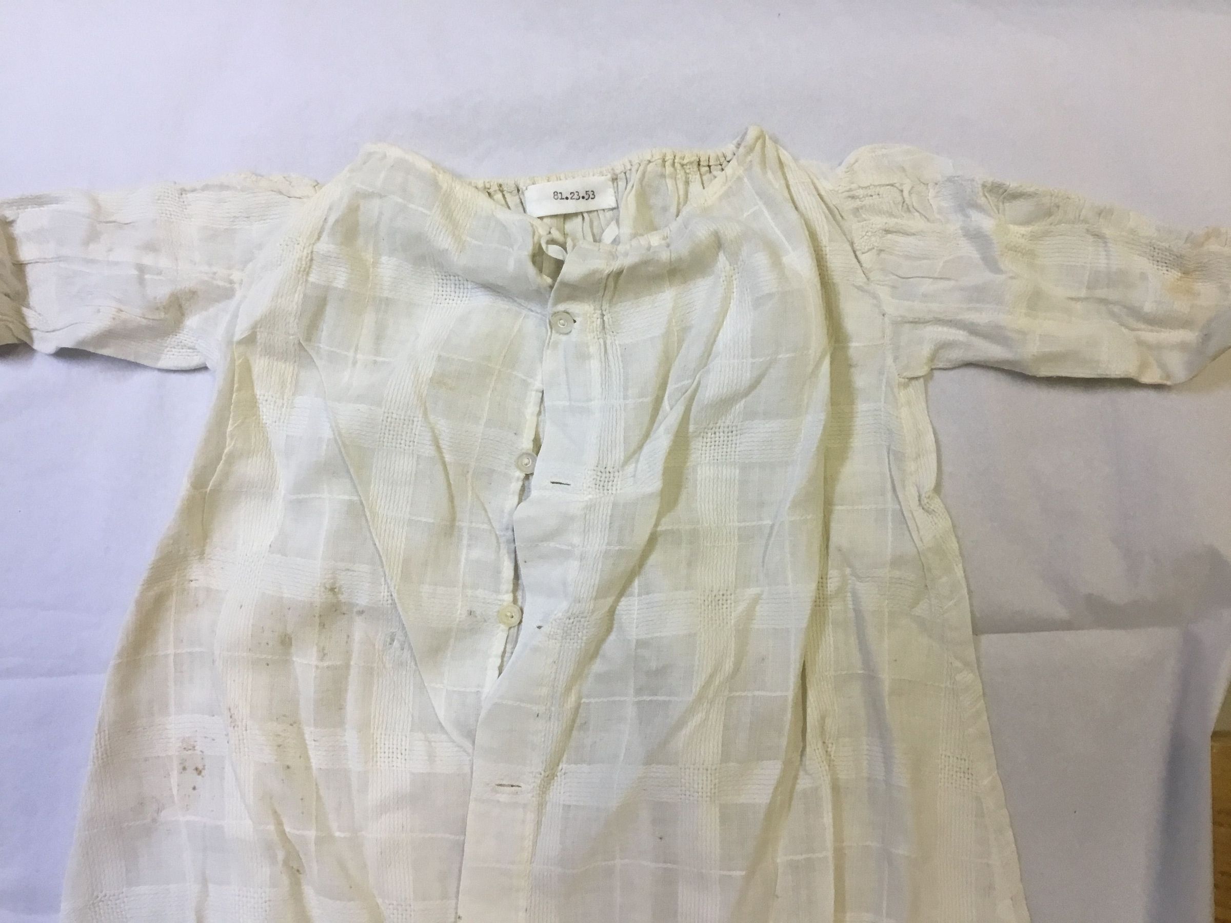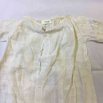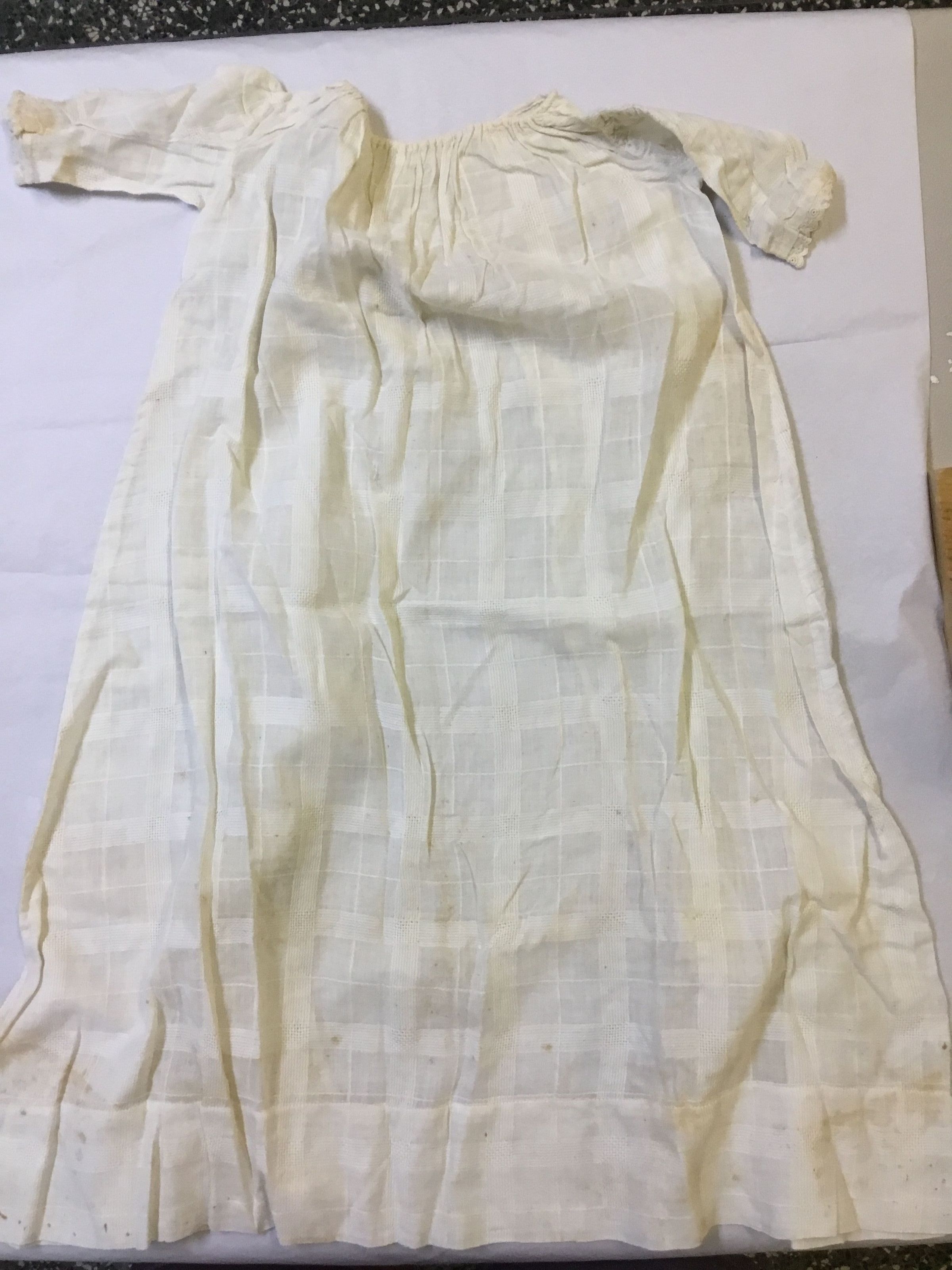 Long baby dress of barred demity. Neck gathered into a draw string; open down back.