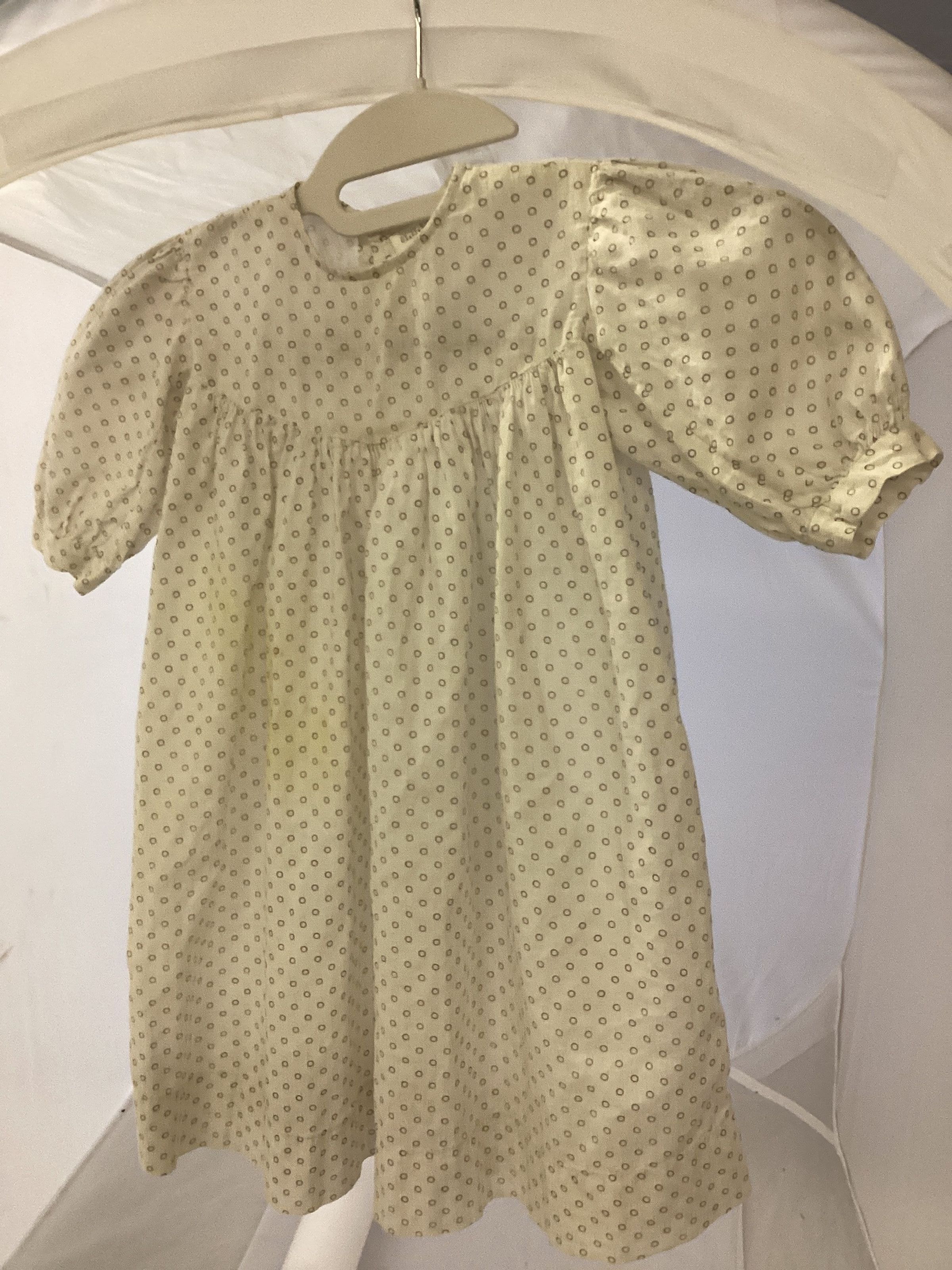 Child's short dress; white cotton with small black circles; skirt gathered into yoke.Collection