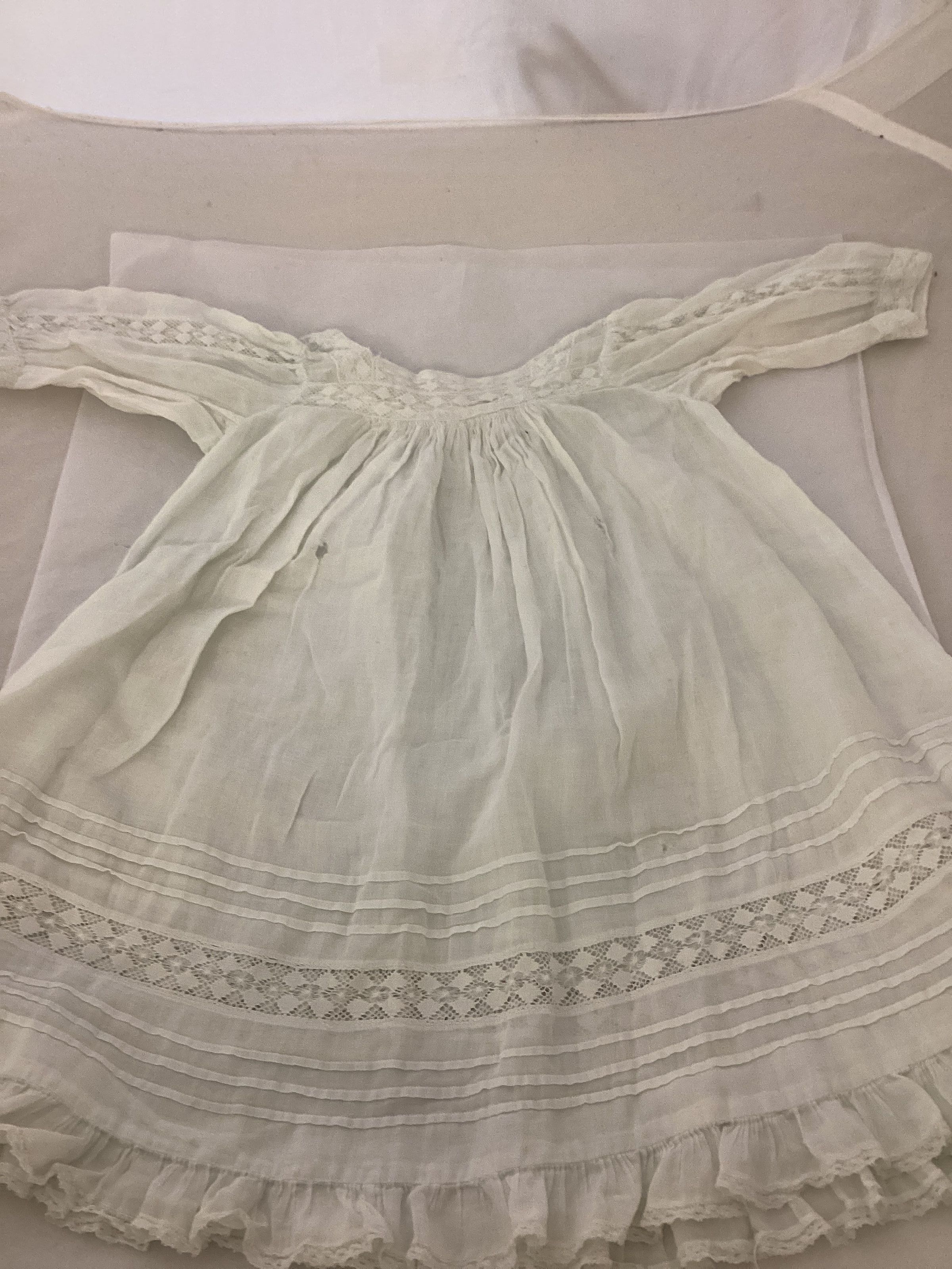 Short child's dress; white lawn trimmed with lace and lawn; square yoke self ruffle edged with lace on bottom of skirt.