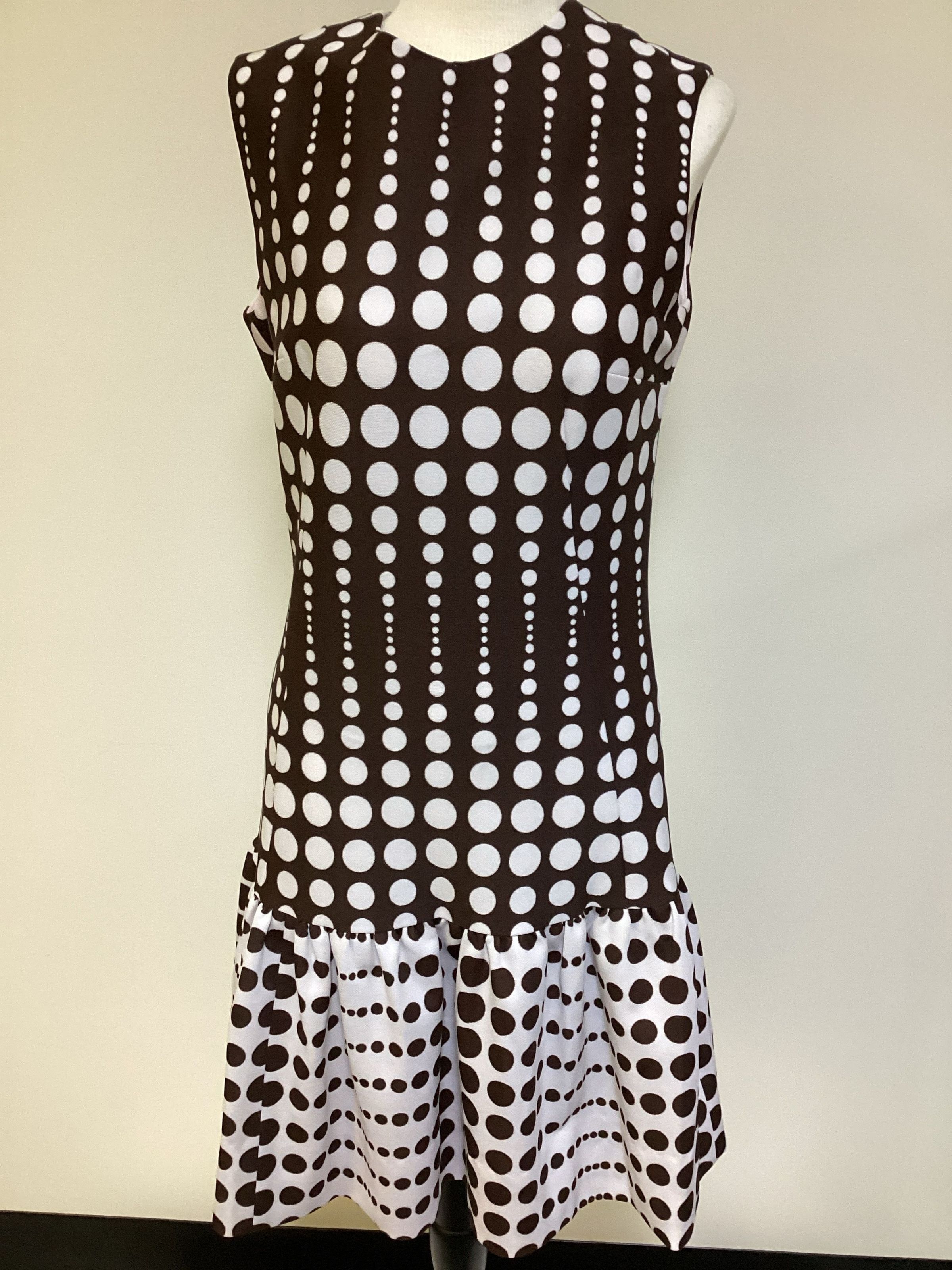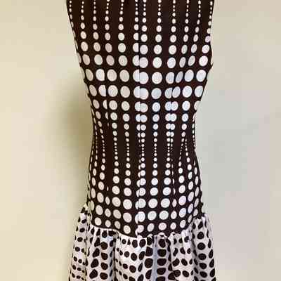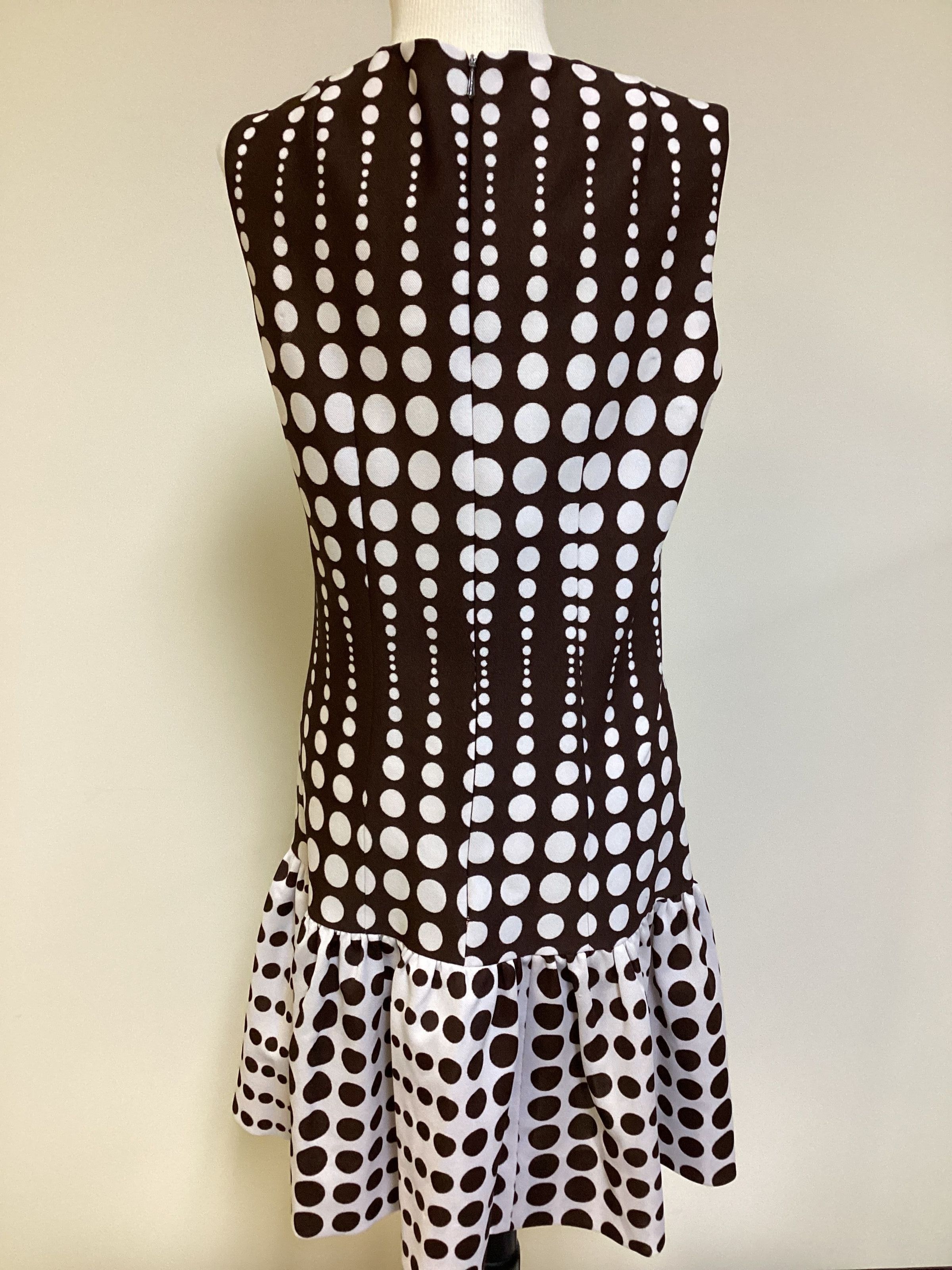 Brown and white polka dot knit dress. Body of dress has white polka dots on brown background and lower skirt has brown polka dots on white background. Zipper in back goes from neck to lower skirt.Collection