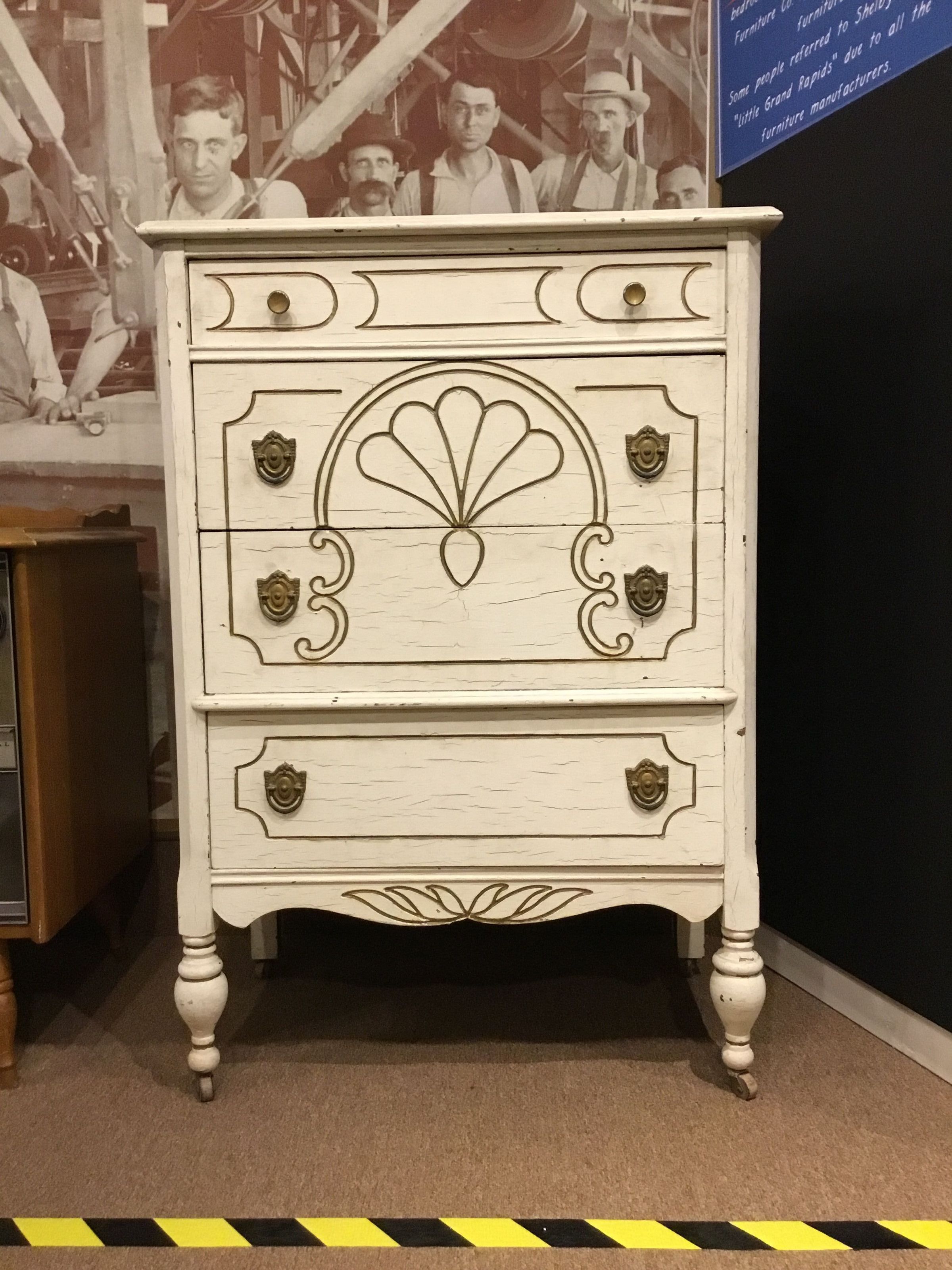 Painted ecru colored dresser with four drawers and brass colored hardware. Decoratively carved surface. On wheels. Manufactured by Spiegel Furniture Co, for John Kelley Co. in Muncie, IND.Made/Created