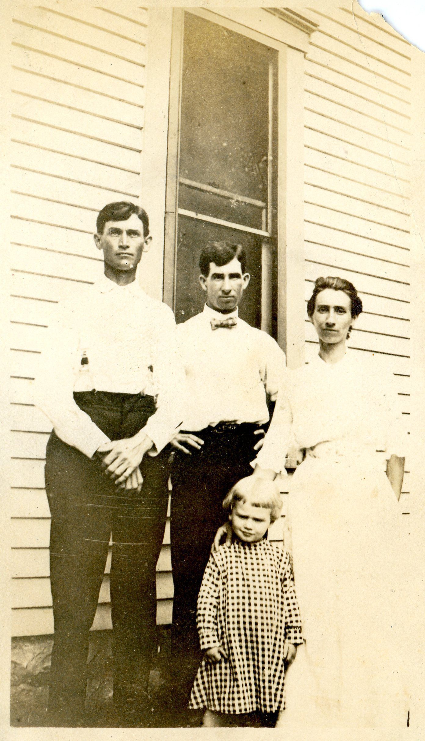 A sepia-toned snapshot of two men, one woman, and a child. From left to right: a tall man with dark hair wearing a white collared shirt and dark pants with suspenders; a slightly shorter man with dark hair wearing a white shirt with a bowtie and dark pants; a young child with short light hair and blunt bangs wearing a checked dress; a woman with hair pushed away from her face wearing a white dress. They stand in front of a window, part of the exterior of a house.Photograph Details