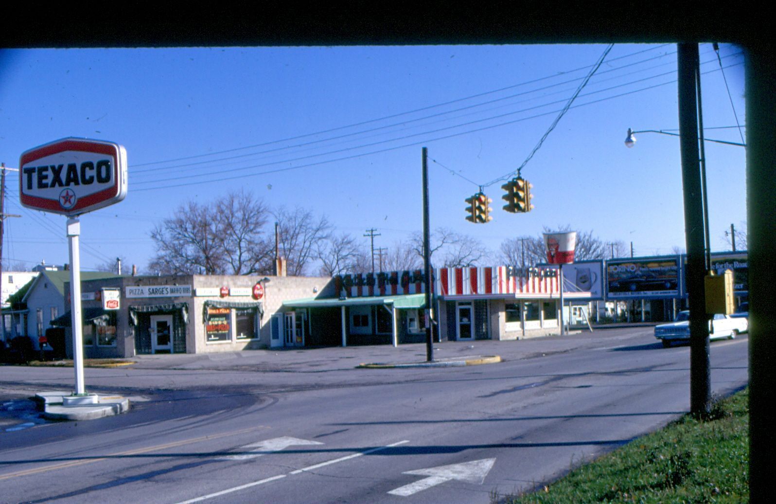 Image is of the northeast corner of East Broadway and Vine Streets. On the left is a Texaco sign and the Kentucky Fried Chicken is visible in the photo.Collection