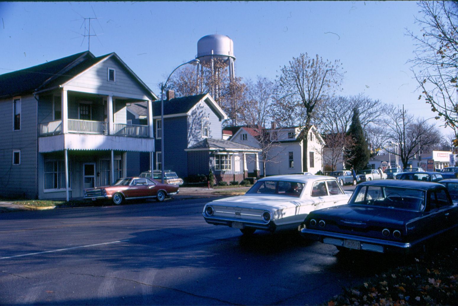 Image is of the north side of East Broadway Street in the second block showing residences and a water tower in the background.Collection