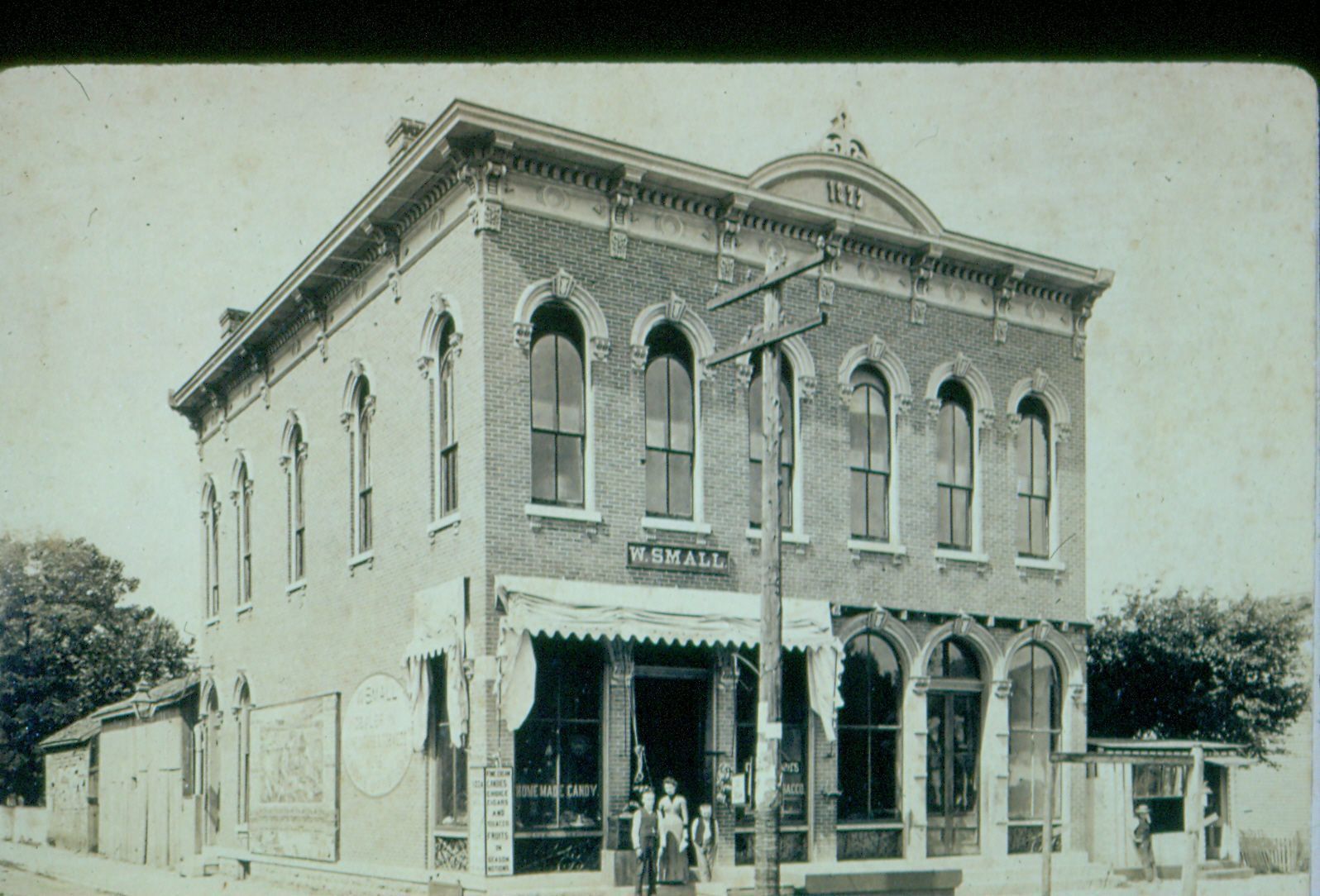 Donation, 07/26/2005. Black and white photographic slide in landscape format. This is a slide of a photo. Marked: "E. Wash N.E. corner Pike and Wash". 1890. "W. Small" over entrance.Collection