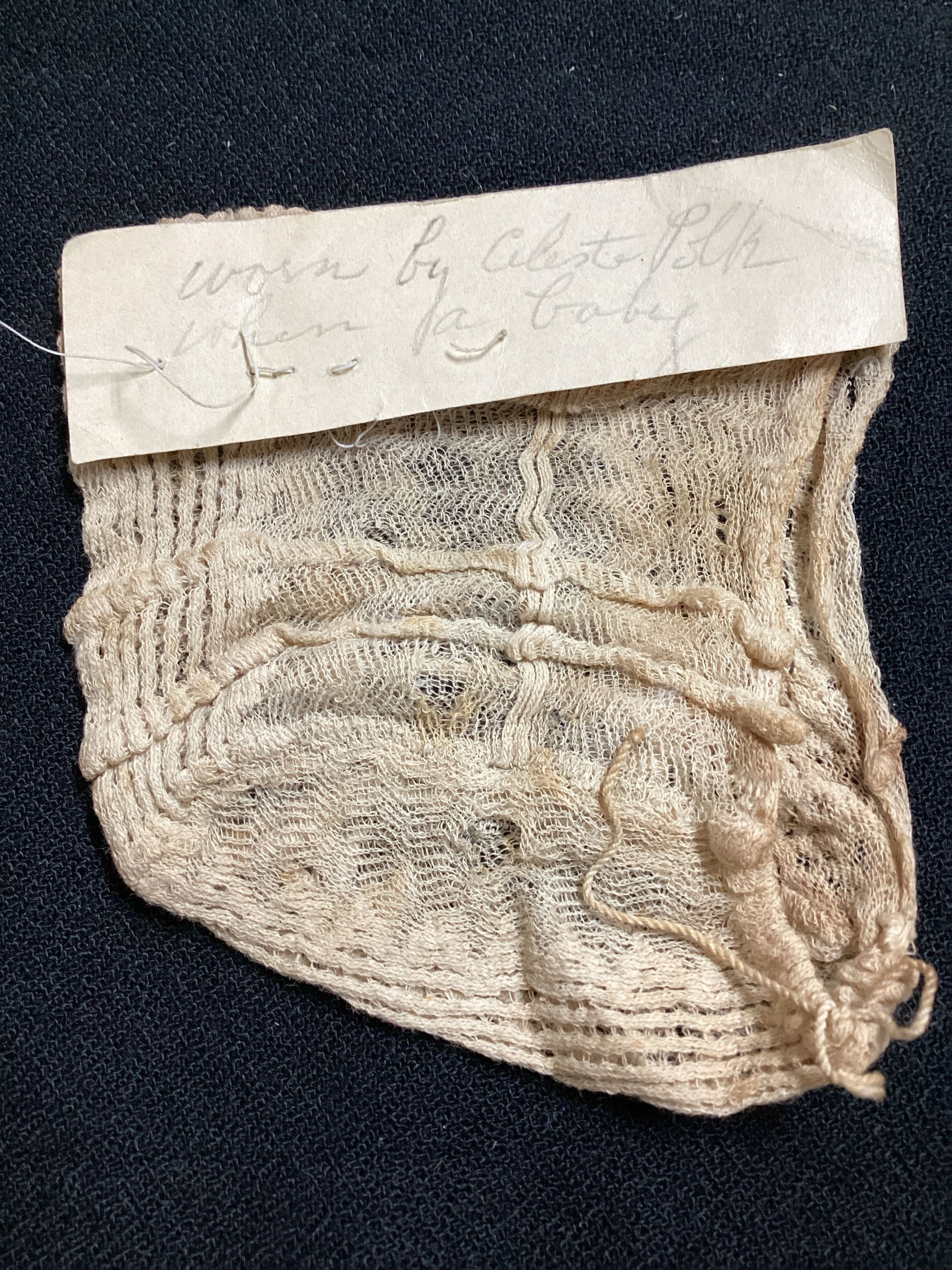 Attached is a note, reading: worn by Celeste Polk when a baby.Clothing/Dress/Costume Details