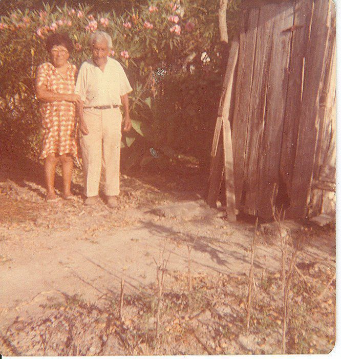 3.5" x 3.5" color glossy photo in portrait format. Image is of an elderly couple, possibly Roy Ortiz's parents. The woman wears a plaid dress, short, dark hair, and glasses. She hold the arm of the elderly man, who has white hair and wears light colored pants and a white shirt. They stand in front of a flowering bush and to the right of the photo is a dalapadated wodden structure. There is a dirt path in front of the couple.Collection