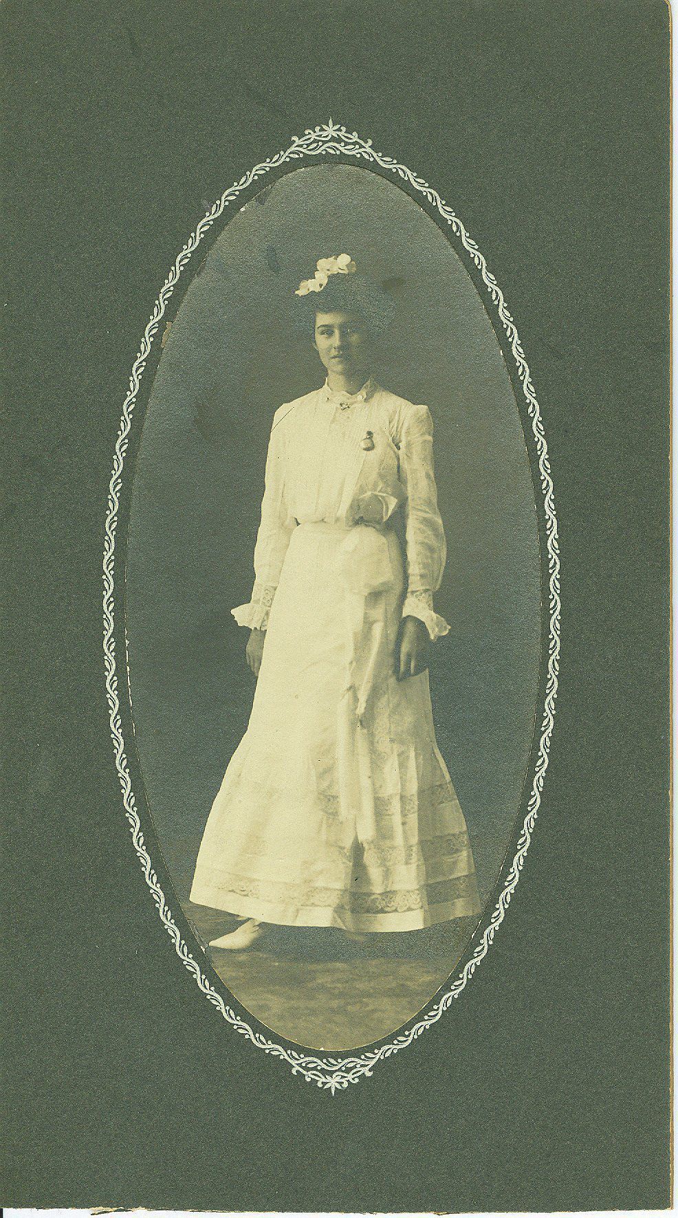 3" x 6.5" sepia, oval, glossy photo in portrait format mounted on a 5" x 8.75" cardboard mount. Image shows a full body portrait of a woman in a white dress. The dress has lace detail on the sleeves and bottom portion of the skirt. One white shoe is visible from beneath the dress. She wears her hair up and has white flowers in it.Collection