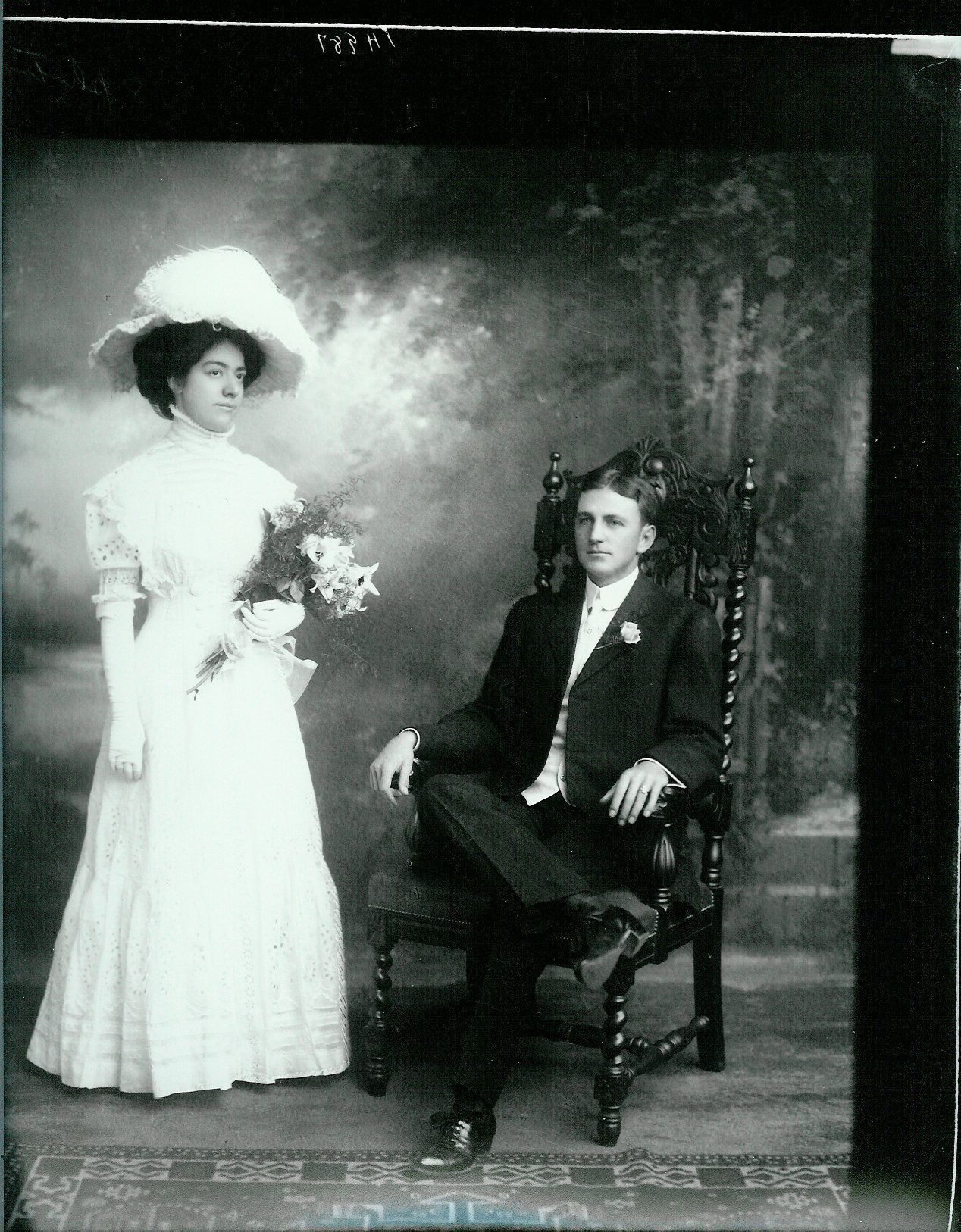 His hair is parted in middle. He is wearing a 3-piece suit w/ tie shoes, has a boutonniere in coat lapel, ring on third finger of left hand. His R leg is crossed over L leg. Woman is standing, has hair up on head, wearing large flat hat decorated w/ plumes, floor-length dress of eyelet lace, stand-up collar to jaw line, sleeves end at elbow, wearing long white gloves that meet dress sleeve.