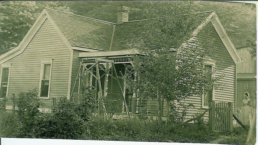 Donation, 07/26/2005. On back in ink: "House just inside/front gate of Fairground/just east of gate." Image is of a clapboard house, a double swing in the yard, small tree, bushes, gate in fence, woman on right of image.Collection