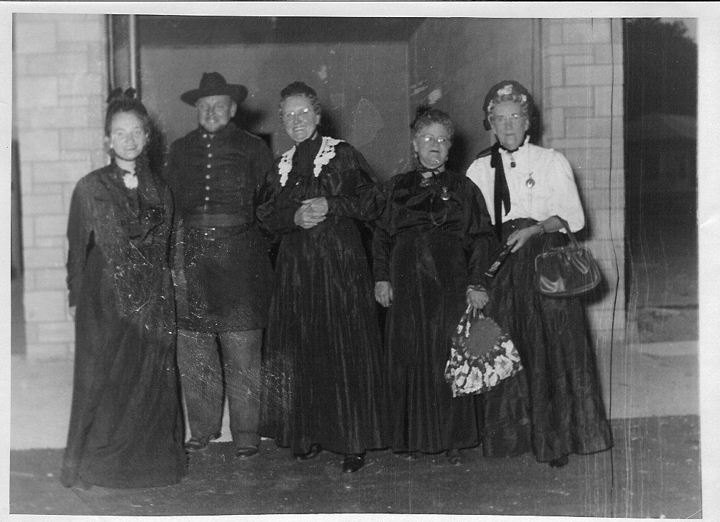 B&W photo; (4) women and (1) man standing in front of a block building, man is dressed in a uniform that buttoms down the front, a hat with a large brim, women are dressed in long dressed, all are made of dark shiny material, all are wearing hats that tie under the chin, the woman on right is wearing a light colored top the woman next to her is holding a flowered purse.Collection