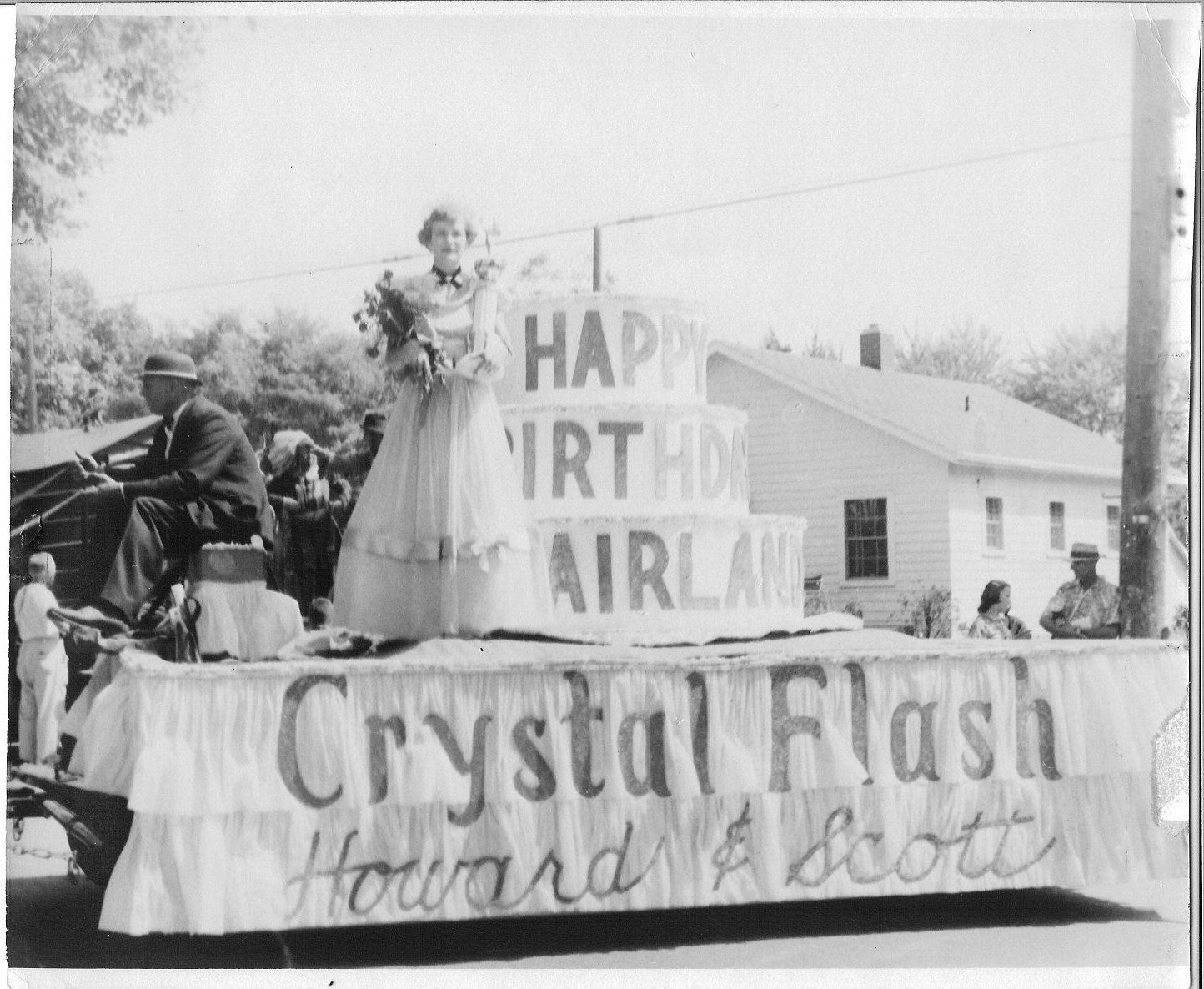 Black and white photographic print. Subject appears to be a horse-drawn float; skirt of float has lettering reading "Crystal Flash/Howard & Scott". Top of float has male driver, young girl standing with long dress and holding flowers and trophy. Three-layer cake figure, lettering on cake reads: 'HAPPY BIRTHDAY FAIRLAND" frame house in background, man leaning against utility pole talking to young girls. Image is slightly out of focus.Collection