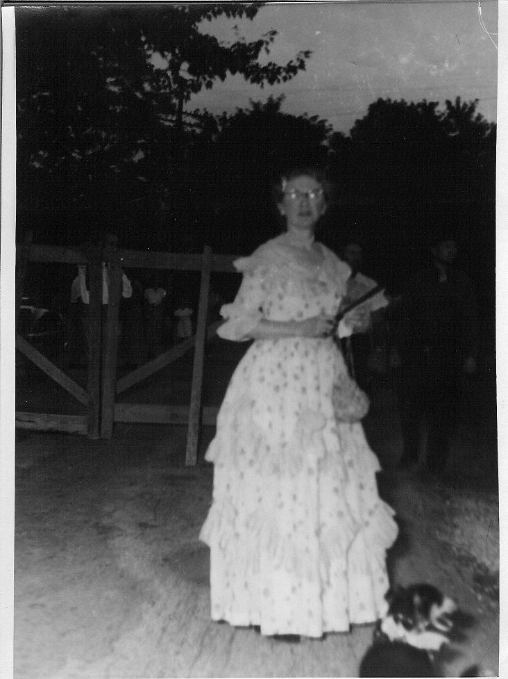 B&W photo; woman dressed in a print long gown, ruffles at the top, elbows and two more at middle of skirt, she is wearing glasses and holding a fan, and a purse, part of a dog is laying in front of her, in background is a tall wood framed gate with a man holding the two sections together, on the right side of picture is two men and one is dressed in dark clothesCollection