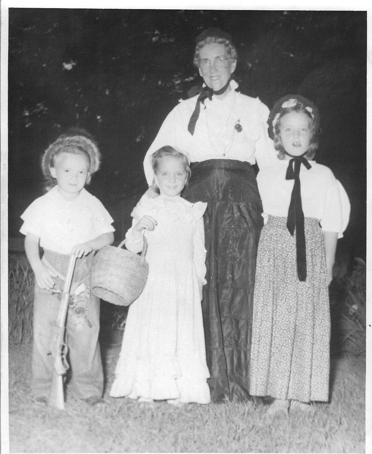 Black and white photographic prints. woman and three children, boy is wearing a fur hat, has a gun and holster on and holding a gun in front on him. girl to left is wearing a long drsss, holding a basket and had on a hat that ties undr chin.. woman wearing dark skirt of shiny material, light blouse a hat that ties undr chin and a pin over the left of her chest. girl far right is in a print skirt and light blouse, wearing a hat that ties under chin with dark bow at neckCollection
