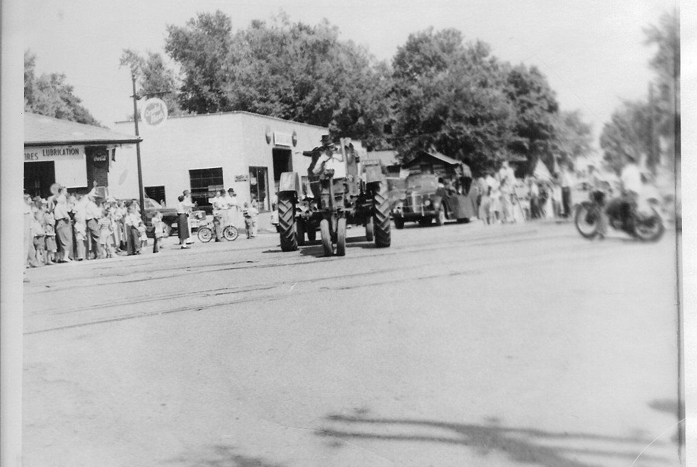 Black and white photographic print; two men on a tractor; one on a motor cycle; a large group of people in bacground; there is three sets of railroad track; two buildings in background; on the building to the left is a sign that reads, "LUBRICATION", a Coca-Cola sign, and a sign on a pole that reads, "Crystla Flash". Picture is very much out ot focus on the right side.Collection
