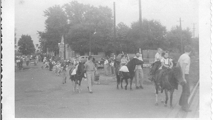 Black and white glossy snapshot photograph in landscape format of a parade, 3 horses , the first one has a little girl and boy, the second has a little boy and a white sack hanging over the side, the third horse had a little boy riding it also, all 3 are being led by a man; in the background there are people, cars, telephone oles, and a building that looks like it could be a store.Collection