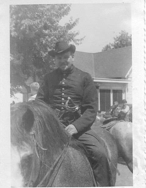B&W photo; Man setting on a horse, horse has a blaze face; man has on a uniform that buttons down jacket front; cowboy type hat, a sword attached to his belt; in background are two men standing, one with his arms crossed, frame house. Picture has a scalloped edge (Closeup)Collection