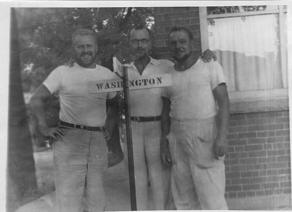 b&w photo; 3 men stnding outside of brick building; Man in middle has his arms around both men; sign in front of men reads "WASHINGTON'; man on ringt has both hands on hips. Picture is out of focus on right side. See "Notes"Collection
