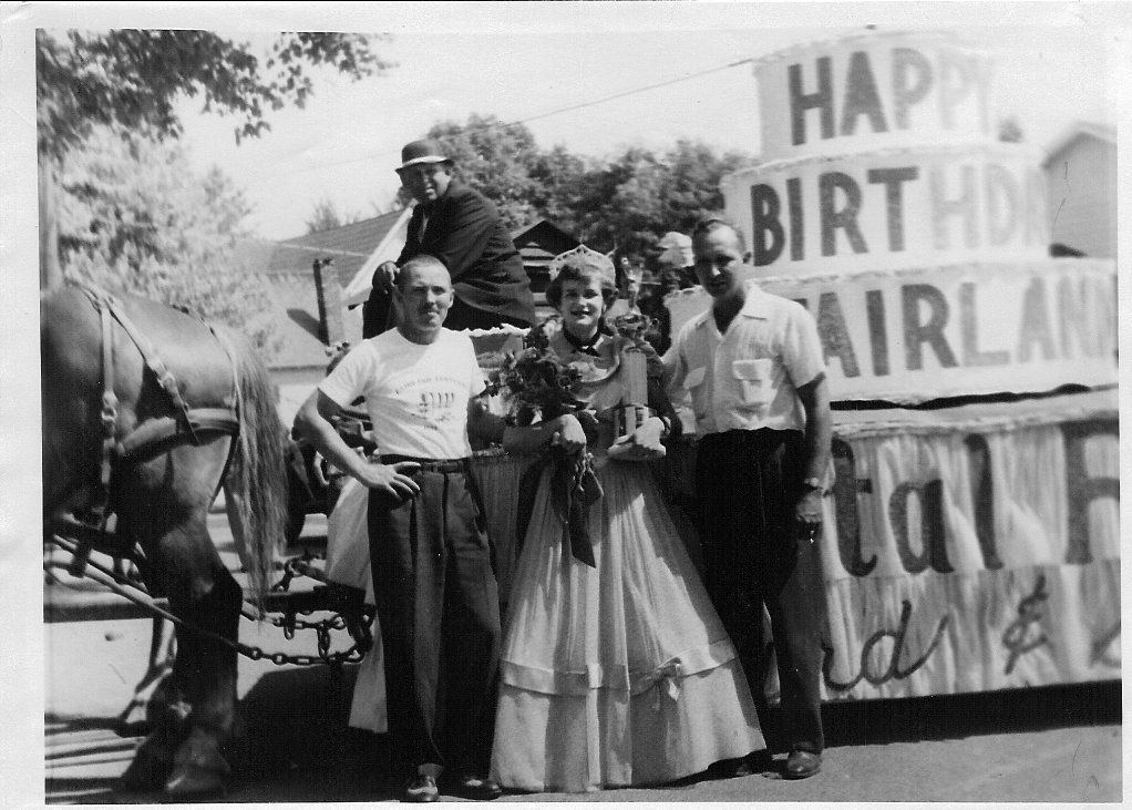 Black and white photograph of a horse-drawn float, one man on float; wearing hat with a jacket' float has three tier cake that read "HAPPY BIRTHDAY FAIRLAND" Standing in front of float is two men w'young girl in long dress, holding rosed and trophy. Man on left of girl has short hair and is wearing 't' shirt that has a covered wagon on it. man to right of girl has wvy hiar, weari white shirt; left side of picture is back hald of a team of horses.Collection
