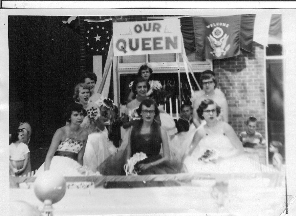 B/W photo of nine girls sitting on a platform. All girls are dressed in formals & carrying bouquets. Girl in middle of back row is holding roses & is wearing a crown. The sign above her says "OUR QUEEN". Photo was taken at the Fairland Centennial, Shelby Co. Indiana. Used by Ruth Timney Nigh (1895-1978). Donation, 9/8/1983.Collection