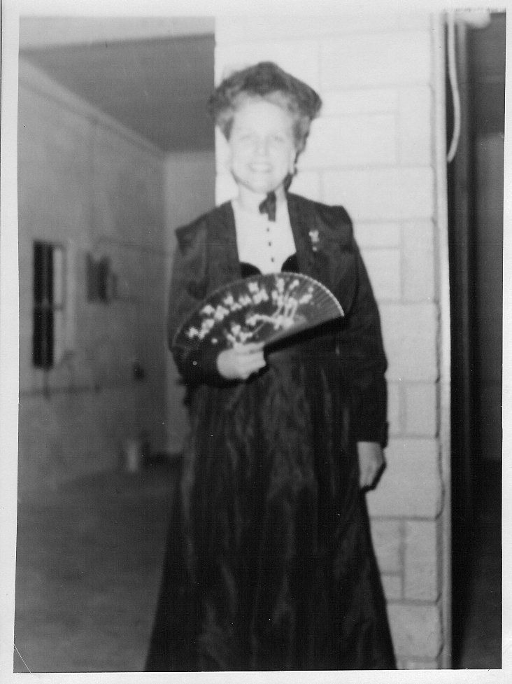 B&W photo; woman standing in front of block type building, she has on a long dress with a short jacket, dress is made of a shiny material, pin on her left side on jacket, she has on some type of hat that ties under the chin, she is holding a fan with a flower pattern on it.Collection