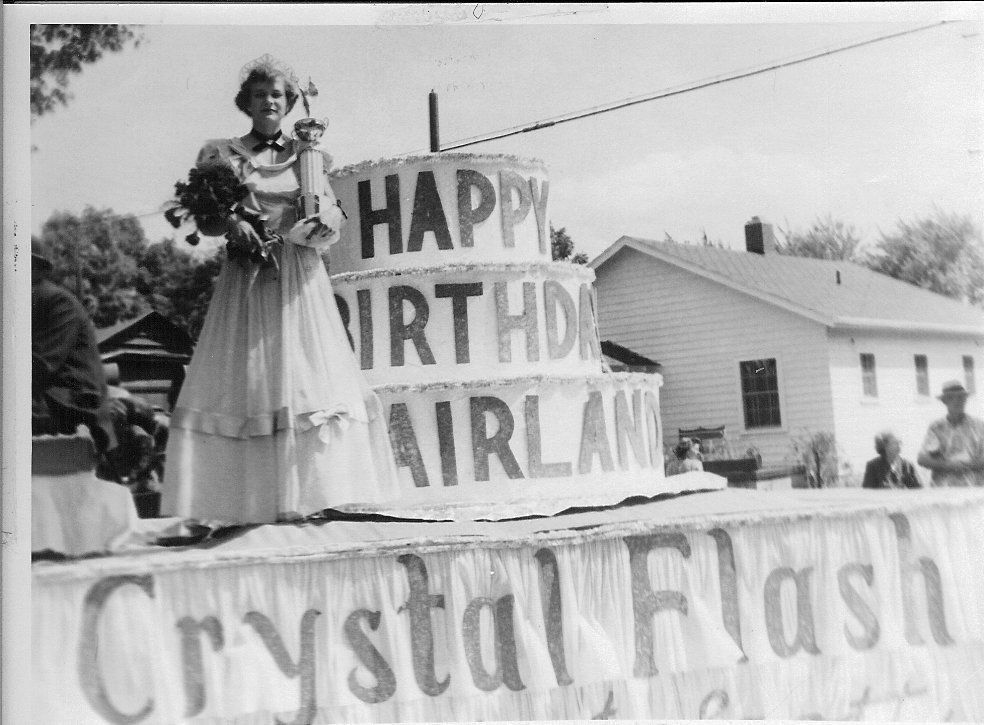 Black and white photographic print. Subject is a horse-drawn float with skirt lettering that reads: "Crystal Flash". Top of float has young girl standing near three-tier cake that reads "HAPPY BIRTHDAY FAIRLAND' Girl has on long dress and holding roses and trophy. In background is a frame house; one man and one woman standing in lower right hand of picture. Similar to 1983.053.025.Collection