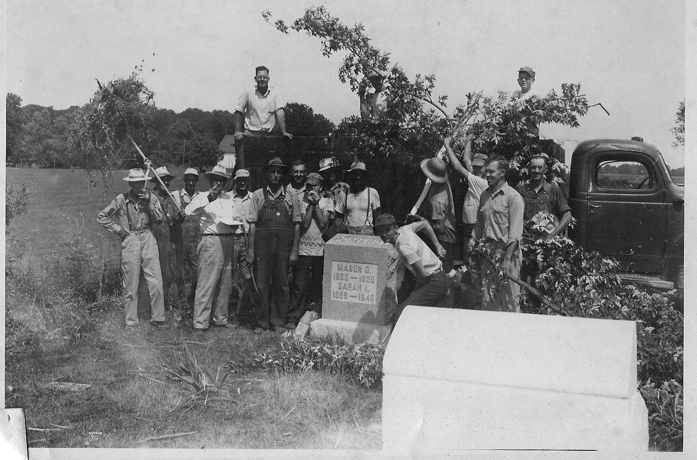 Picture of several men clearing Fairland Cemetery during 1952 Fairland Centennial 1852-1952, Fairland, Indiana.Collection