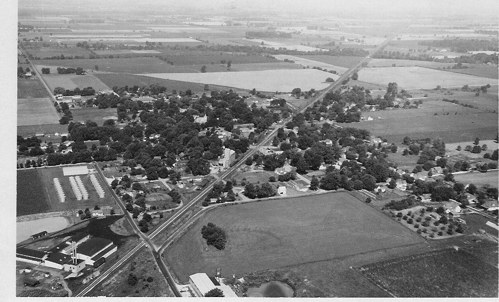 Black and white photograph. An aerial view of Fairland, Indiana. Photo is looking down so that railroad track appears to cut through center of town; tracks are crossed by road in lower left corner; also in lower left corner is a large building, about it is storage bins, town surrounded by fields.Collection