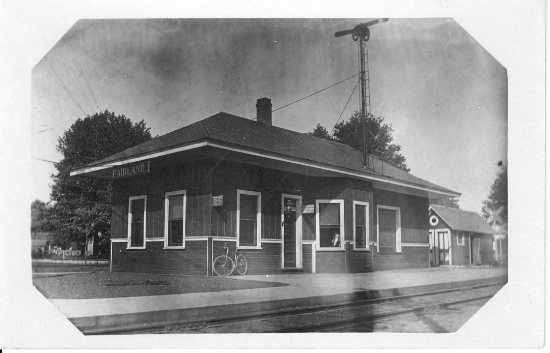 B&W image on post card paper; subject is a railroad station; lower part of building has horizontal siding where as upper part of building has vertical siding; where different sidings meet is a white trim board, window and door frames also appear to be trimmed in white; has a hip style roof; hanging under one soffet is sign that reads "FAIRLAND"; track side of building has a bay area and over this section is a semaphore tower on the roof; bicycle leaning against building and in background is small shed trimmed like the station; has a cement platormCollection